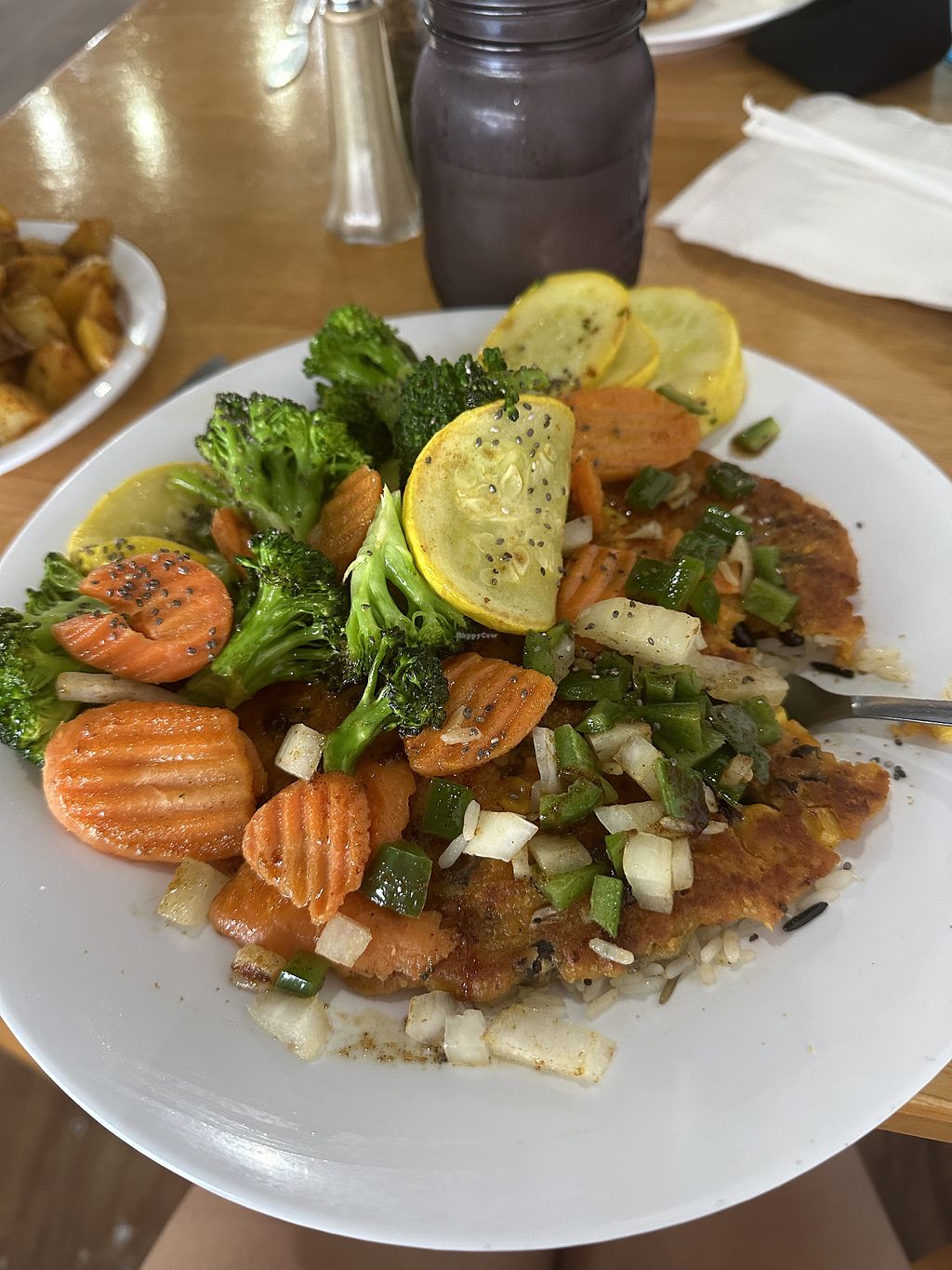 I ordered the Vegan Bowl. It was a very large portion and also came with a side. I am pretty sure that the whole thing was drenched in butter though.