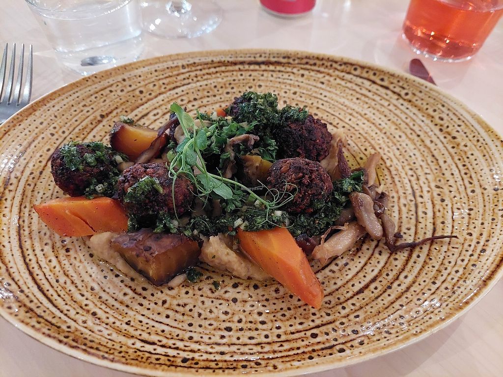 Dinner: The dinner options are the same for vegans every night. When I was there it was a very good beet appetizer, a dinner of falafel-adjacent croquettes with veggies and potato mash that was good but WAY too oily, and a vegan cashew cheesecake. I tried the cake on a different night and the crust was awesome but the cake itself was a bit bland.