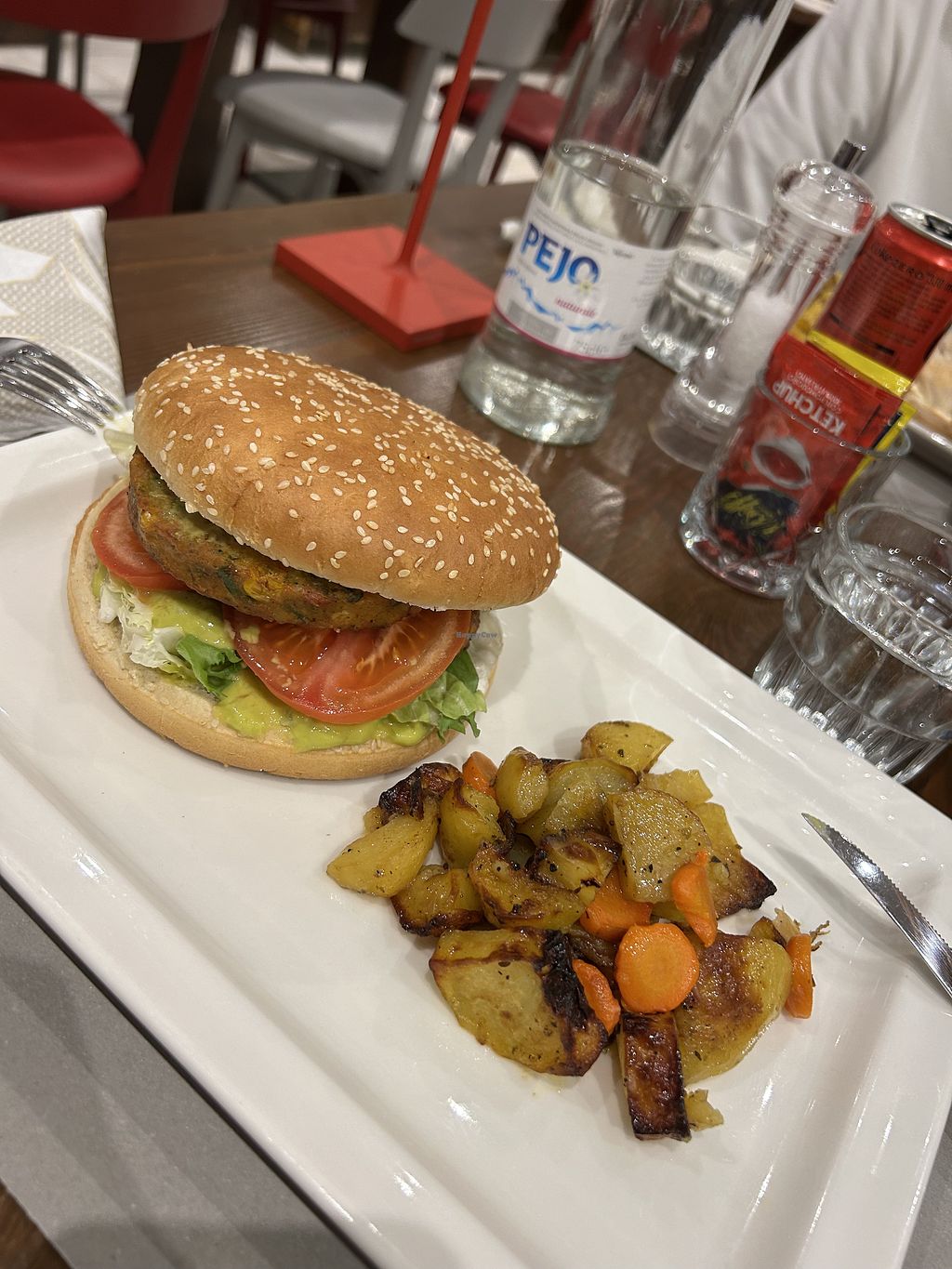 Serves meat, vegan options available. Restaurant in the center. Offers a vegan burger and roasted potatoes. Open Mon-Sun 10:30-23:30.