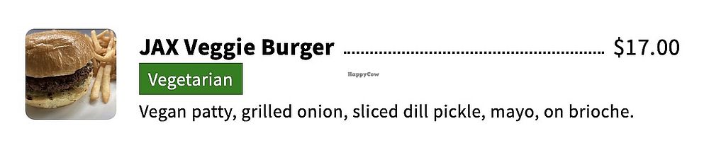 Serves meat, vegan options available. Offers limited vegan options such as the Mediterranean quinoa salad (request without feta) and the JAX veggie burger (request without mayo; confirm if bun is vegan). Open Mon 4:00pm-8:00pm, Tue 4:00am-9:00am, Wed-Fri 4:00pm-9:00pm, Sat 11:00am-10:00pm, Sun 4:00pm-10:00pm. Closed Mon.