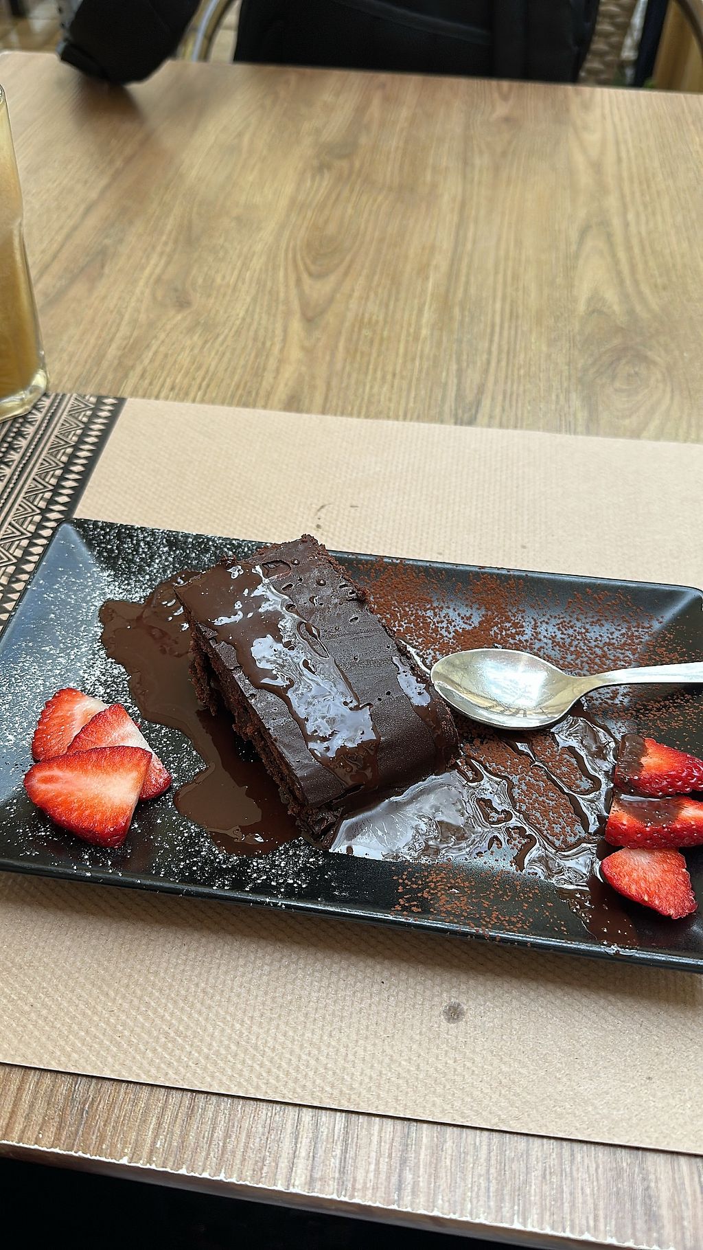 We had the apple and pine nut croquettes, the persa rice, aubergine au gratine (vegetarian) and dark chococlate flan. The food in my opinion was nothing to write home about, I really liked the salad that came along with the croquettes, and nothing tasted bad but it also didn't stand out in any way. The apple nut filling of the croquettes was creative though. Everything tastes and looks very homemade (relatable? like something you could achieve at home) and so is the ambiance of the restaurant, like a family restaurant. It's a cozy vibe. We also had the apple, pinneapple and orange mixed juice (with paper straws), which I appreciated for being authentically fresh, I usually don't like a thick consistency of drinks but it was fine in this case. The flan was okay but nothing impressive either, my omnivore company liked the vegetarian aubergine but the flan not that much. Now on a very positive note, though there were quite a lot of people we immediately got seated, service was really quick, we were done with eating in under an hour, and the waiters were very kind. Everything is clearly marked on the menu and they don't only offer a lot of vegan but also gluten free and sugar free dishes. Also the portions are huge, I sadly couldn't finish my rice because of it and had to pack up the left overs— sadly they only had plastic boxes for take away. And as I said the ambiance was quite good, I can imagine it's even better when the weather is good and you get to sit outside and enjoy the energy of the plaza. I appreciate them for their great service but wouldn't return as I wasn't that into the food.