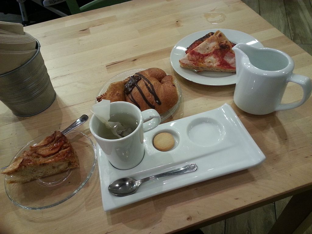 The buffet menu changes daily and you choose what you want and pay by the weight. The daily menu is posted online so you can check out what they are offering beforehand. I had a good-sized square of lasagna and a small side salad for just under 6 euros. It was filling enough especially as I knew I wanted to follow it with a dessert. There are also savory pastries and pizza slices to choose from. Lots of choices for sweet pastries, from cookies, to brioche, to cake. They also offer 4 different fresh juices that change daily. Everything was fresh and tasty.