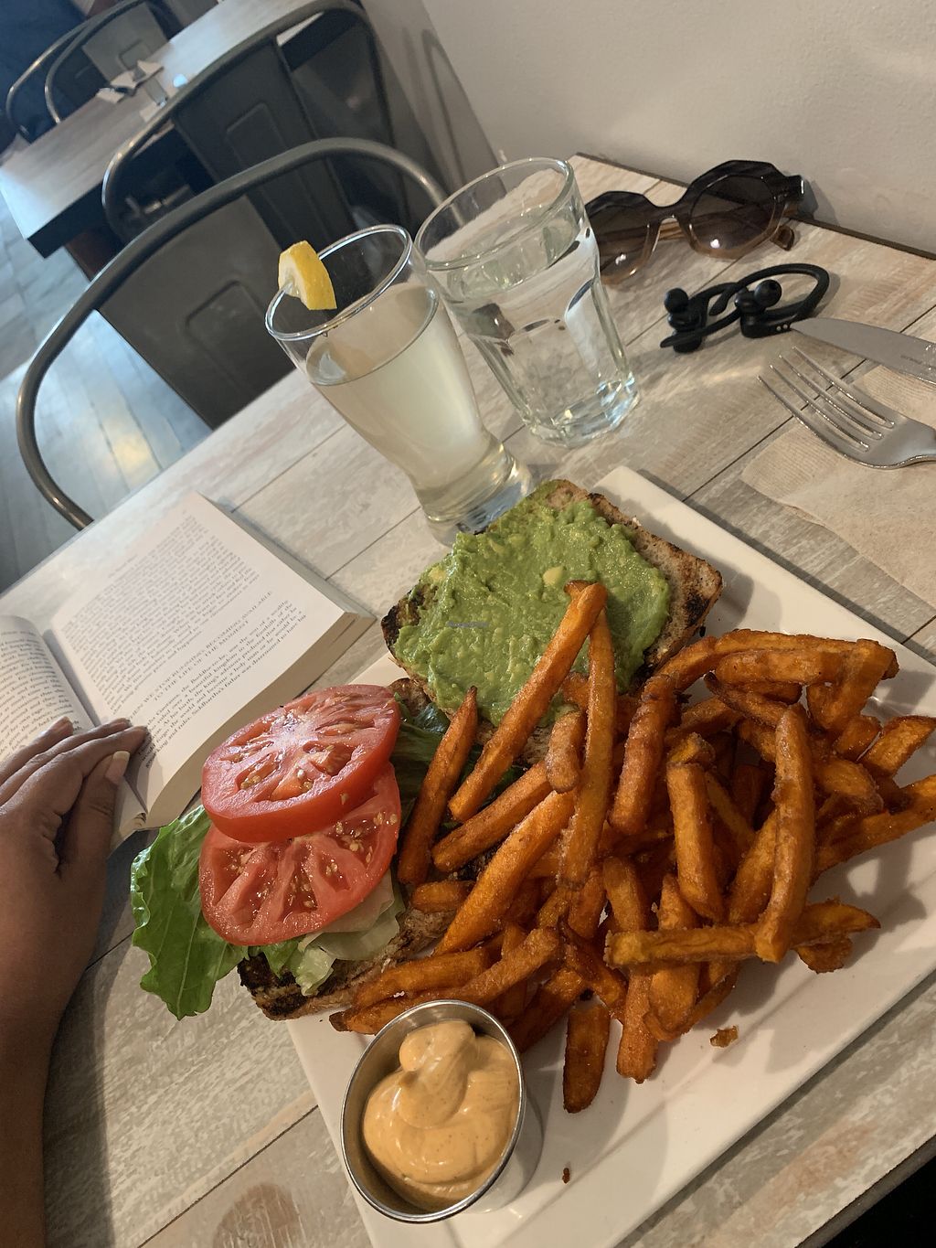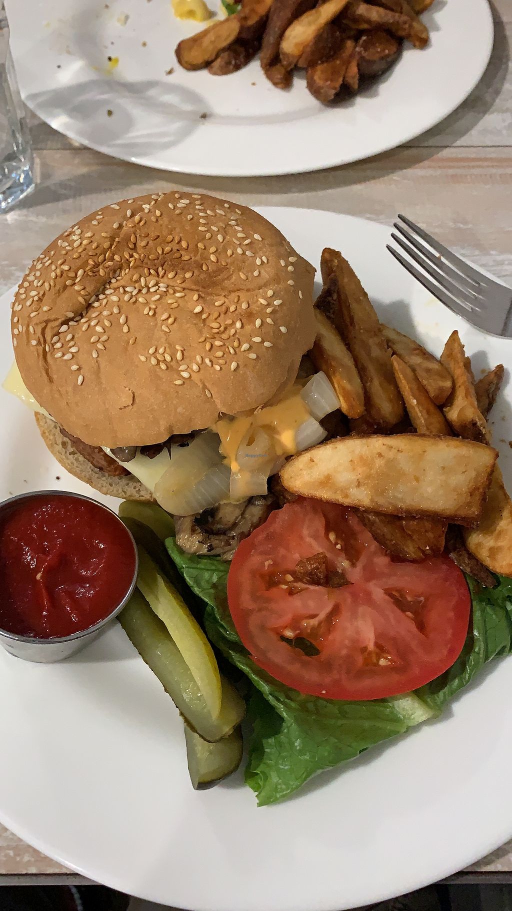 Seitan & mushroom burger (with vegan mozzarella) and truffle potato fr…