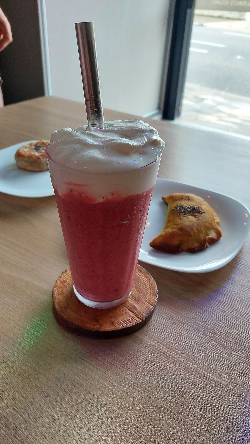 O pão na chapa com ovo vegano é simplesmente surreal! Me surpreendeu porque eu não esperava que o pão fosse tão grande, com certeza valeu o preço. Também pedi um morango cream e estava delicioso.