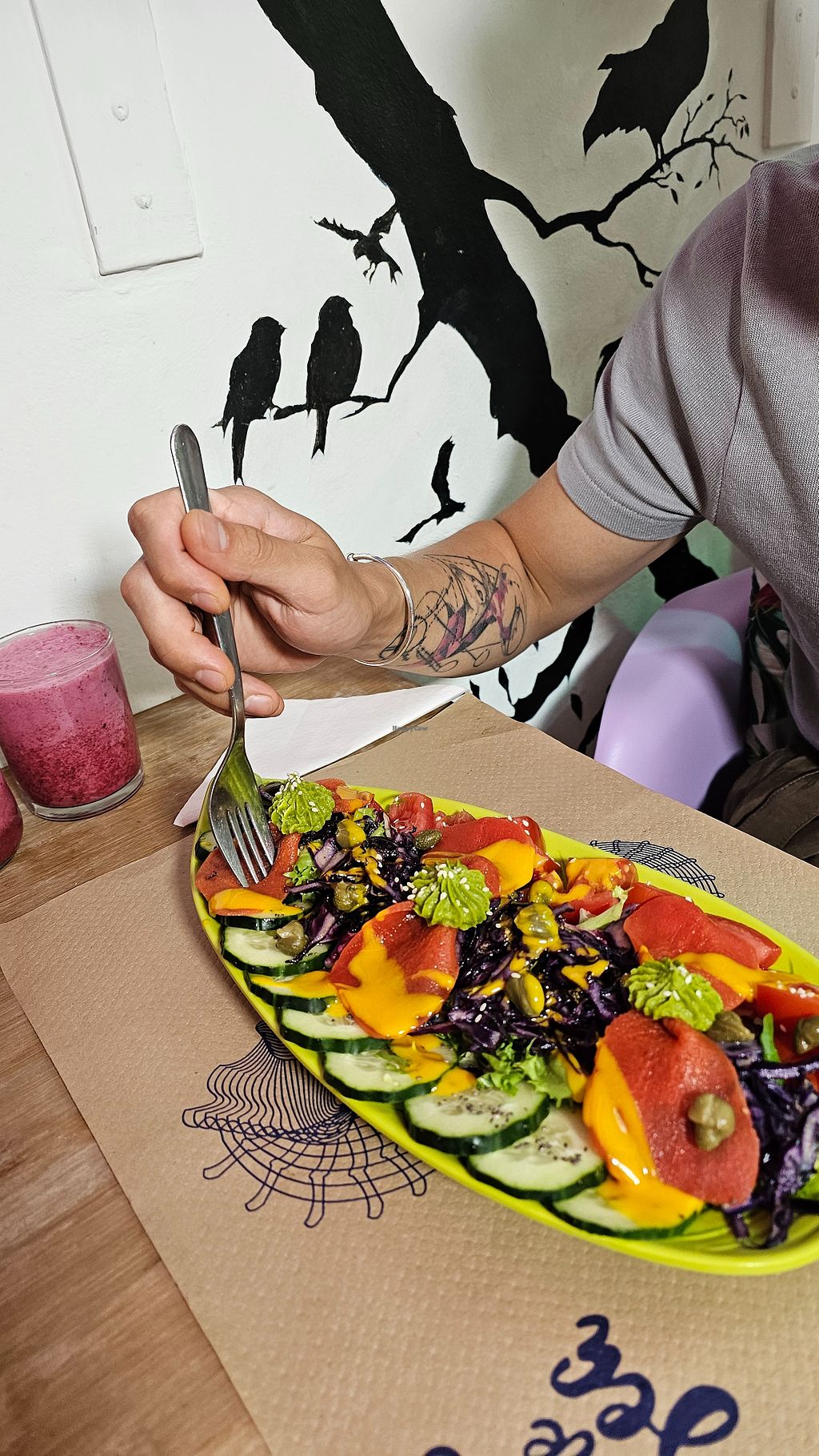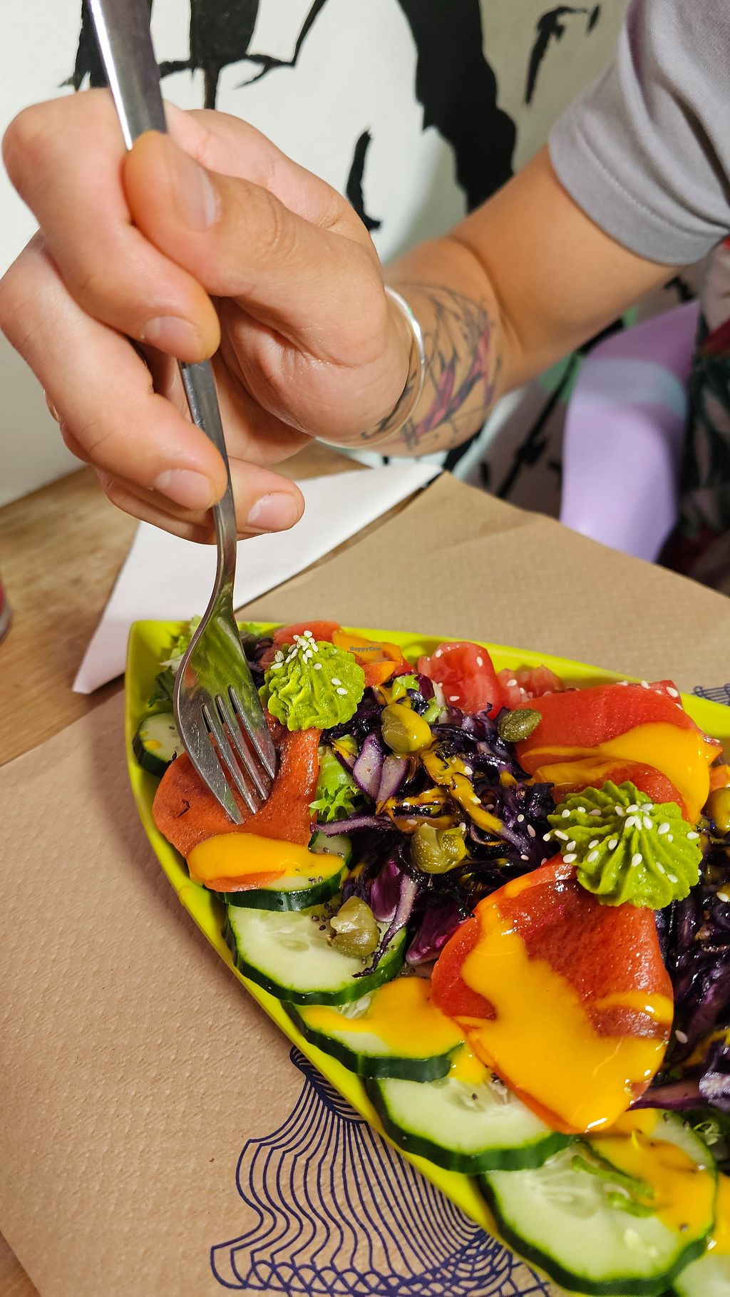 Loved it. Most of the options we’re fully vegan (burritos, tacos, pasta, noodles, hamburgers, arepas, salads with veg-salmon…) it’s clearly stated which ones aren’t. Also all of the desserts were vegan too! (Chocolate tequeños, carrot cake, ice creams, apple strudel, açai bowl…). All of my non-veg colleagues got vegan dishes and loved them too!