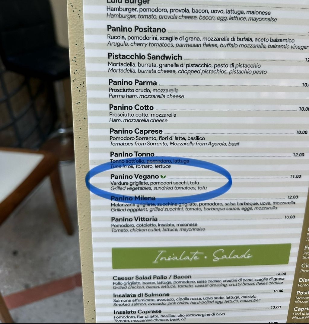 Lacto Ovo Italian Non-veg Serves meat, vegan options available. Upscale restaurant, delicatessen, take-away, & pizzeria on the beach with outdoor seating & clearly labeled vegan options, Vegano tofu panini, lemon sorbet, & salads. Open Mon-Sun 11:00-23:00. More