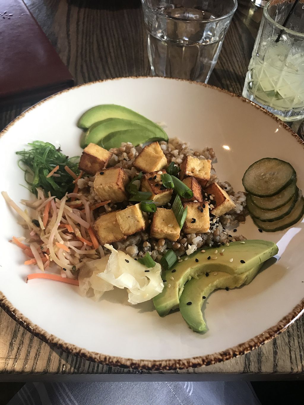 The grain bowl on their menu is labeled vegetarian, but the server confirmed it’s vegan as is. The dish was flavorful and tofu was cooked well. I wish it had been a little bigger, but I was just grateful to have a vegan option that wasn’t a salad. I also had the Where There’s Smoke off the cocktail menu and it was excellent.