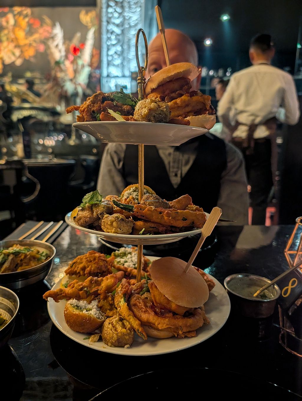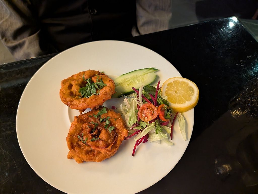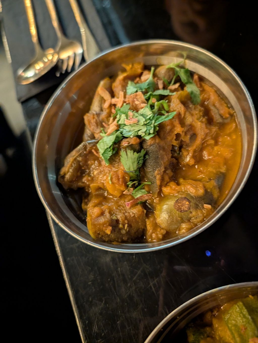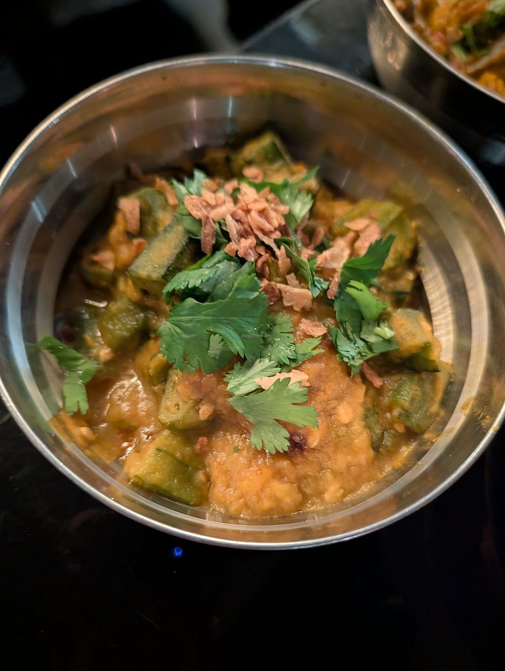 Okra lady fingers, lychee and almond rice and aubergine curry