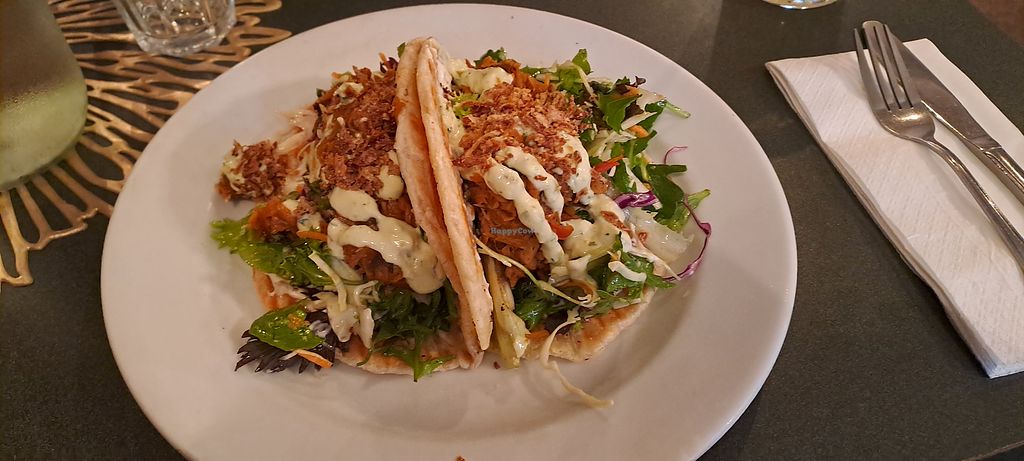 We enjoyed every aspect of our experience here. Sitting in the conservatory was a real treat on a cool day. The staff are vegan savvy and understand their vegan menu. Hubby had the jackfruit BBQ roti; I had the banana flower 'fish' and chips. Both were amazing! Vegan wines and desserts available.