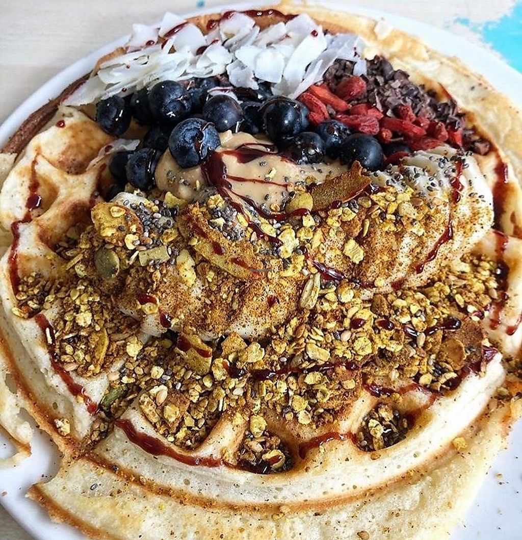 Sourdough waffle with fruits and almond butter