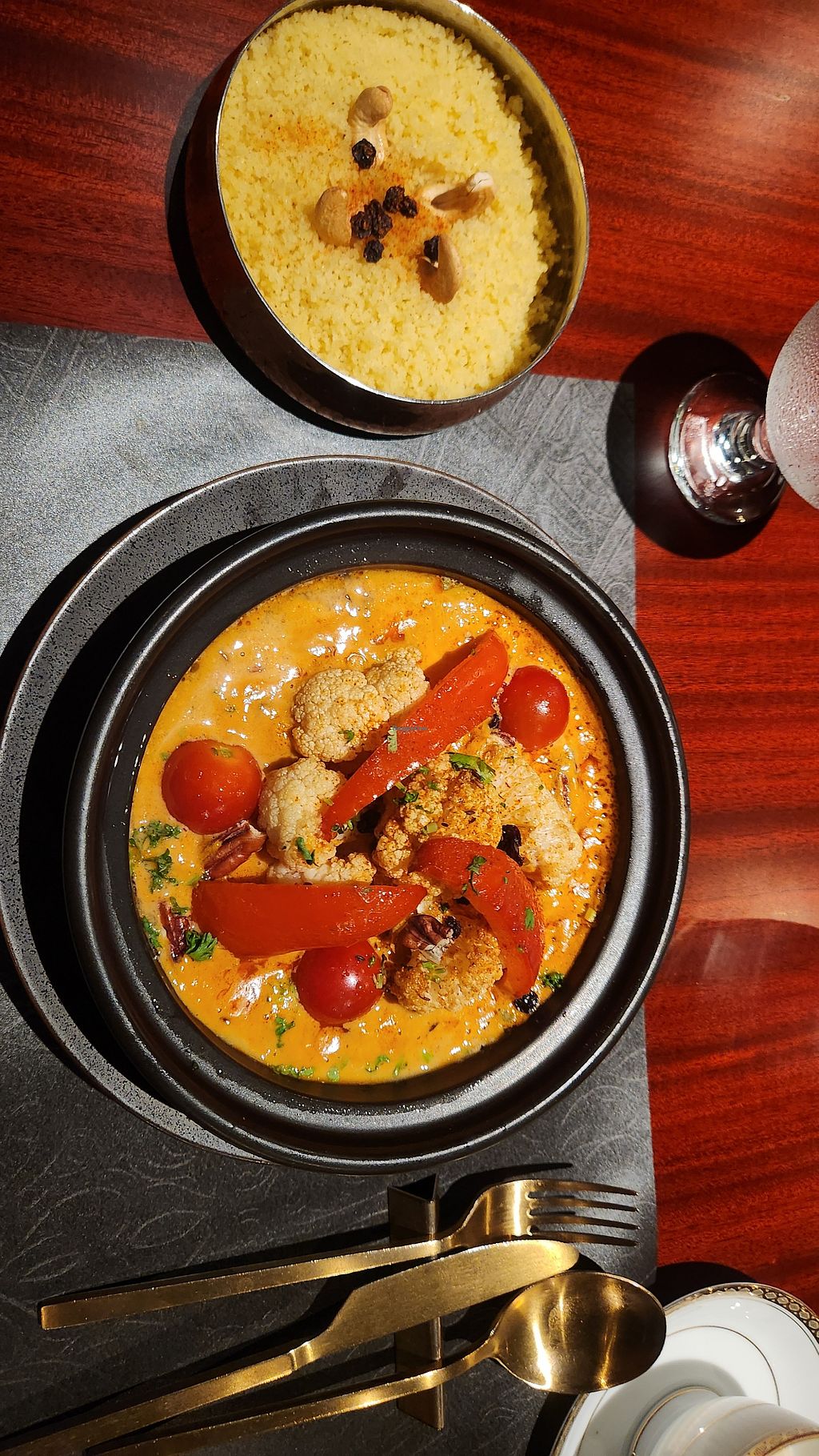Beautiful night view and dark, moody atmosphere and the food was so tasty. I had the cauliflower/harissa tajine and hummus/falafel. Everything was so good.