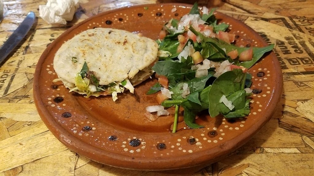 This time, the super sweet owners brought me a corn tamale, a fantastic gordita (a Mexican thin bread sandwich filled with veggies), and an awesome thin crust vegan pizza with veggies.