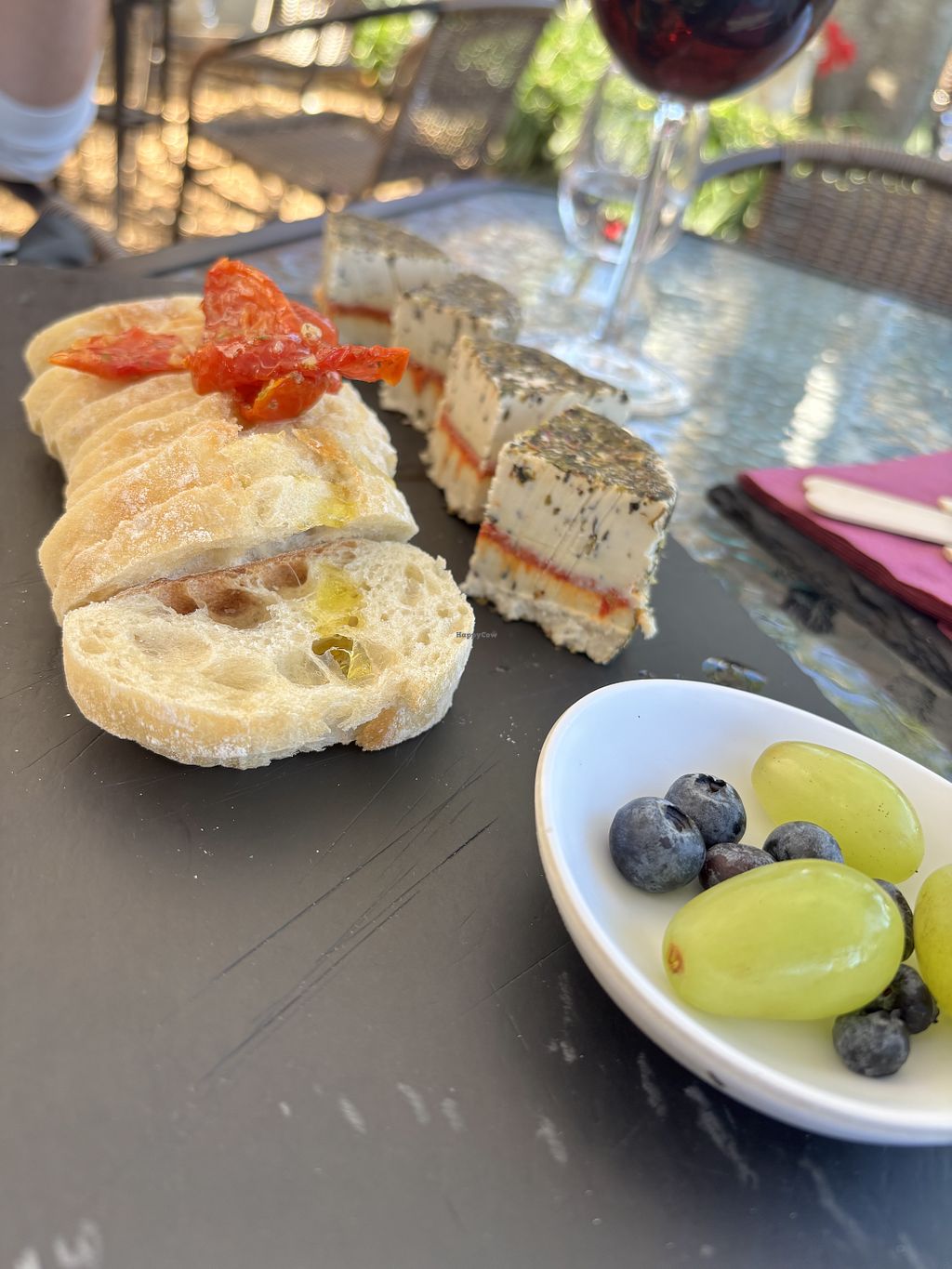 Despite it's appearance, the vegan cheese board is very filling. They also have extra bread available for an additional charge. There is no indoor seating but they have heat lamps. Overall, a great place to have some wine and vegan cheese!