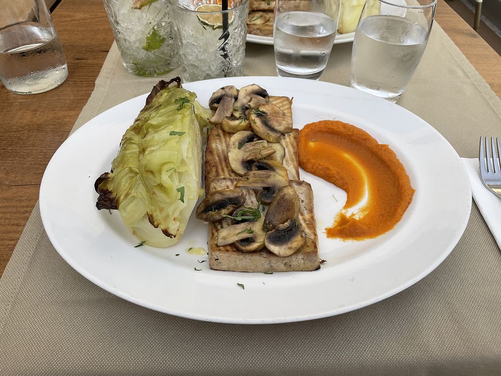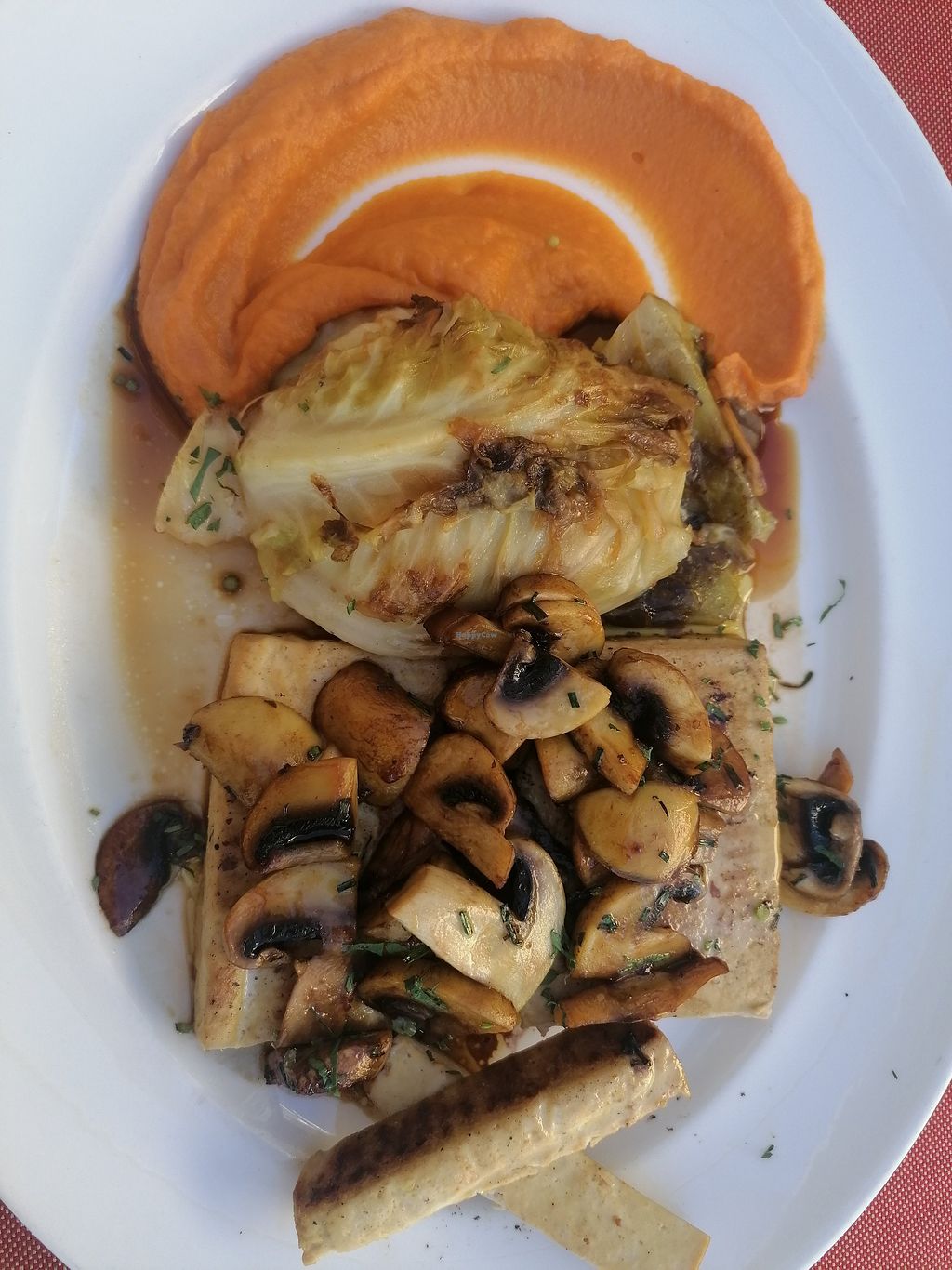 Grilled Tofu & Cabbage (with mushrooms and sweet potato purée)