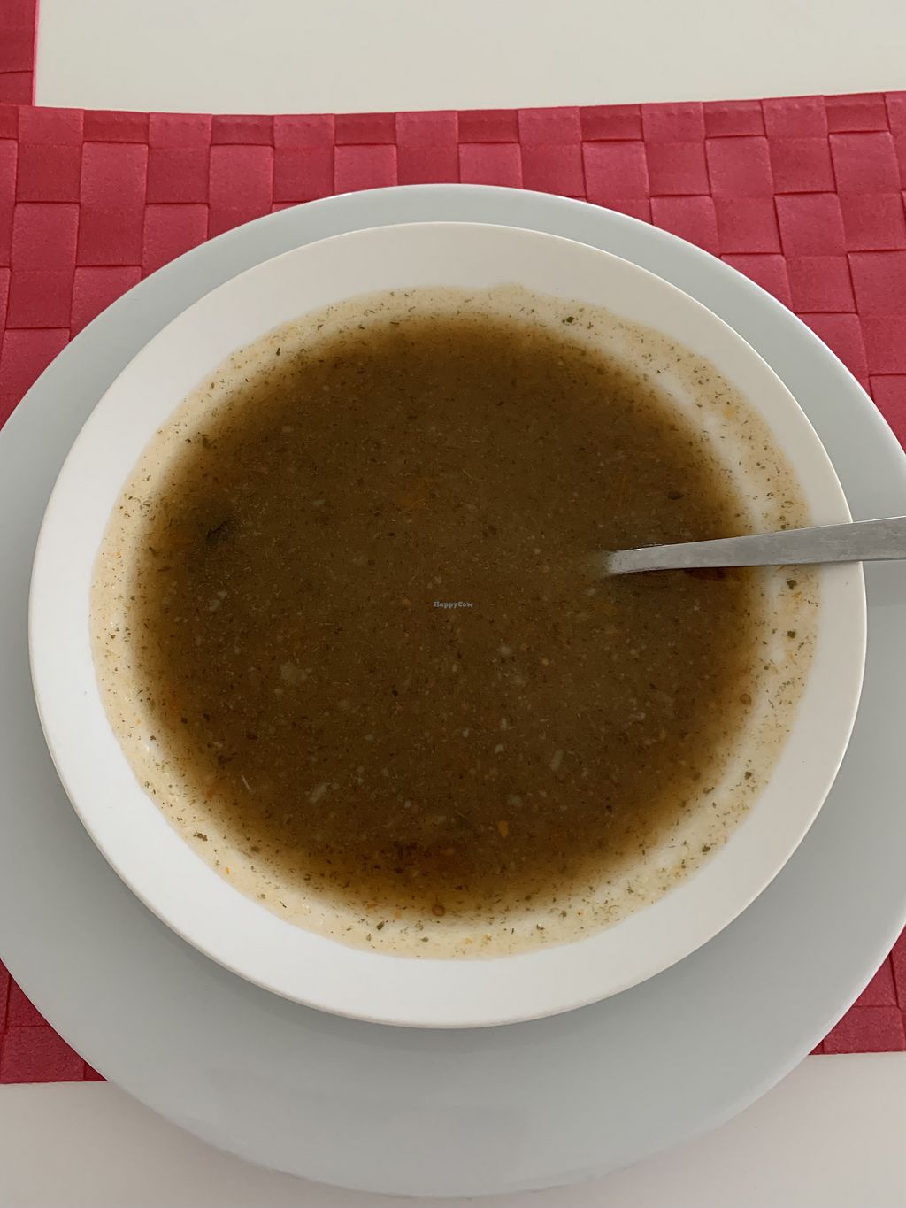 Abbiamo mangiato due piatti principali (Burger di lenticchie e pasta con verdure) entrambi veg, ci hanno servito come antipasto una zuppa che mangerei altre diecimila volte e per finire dessert.