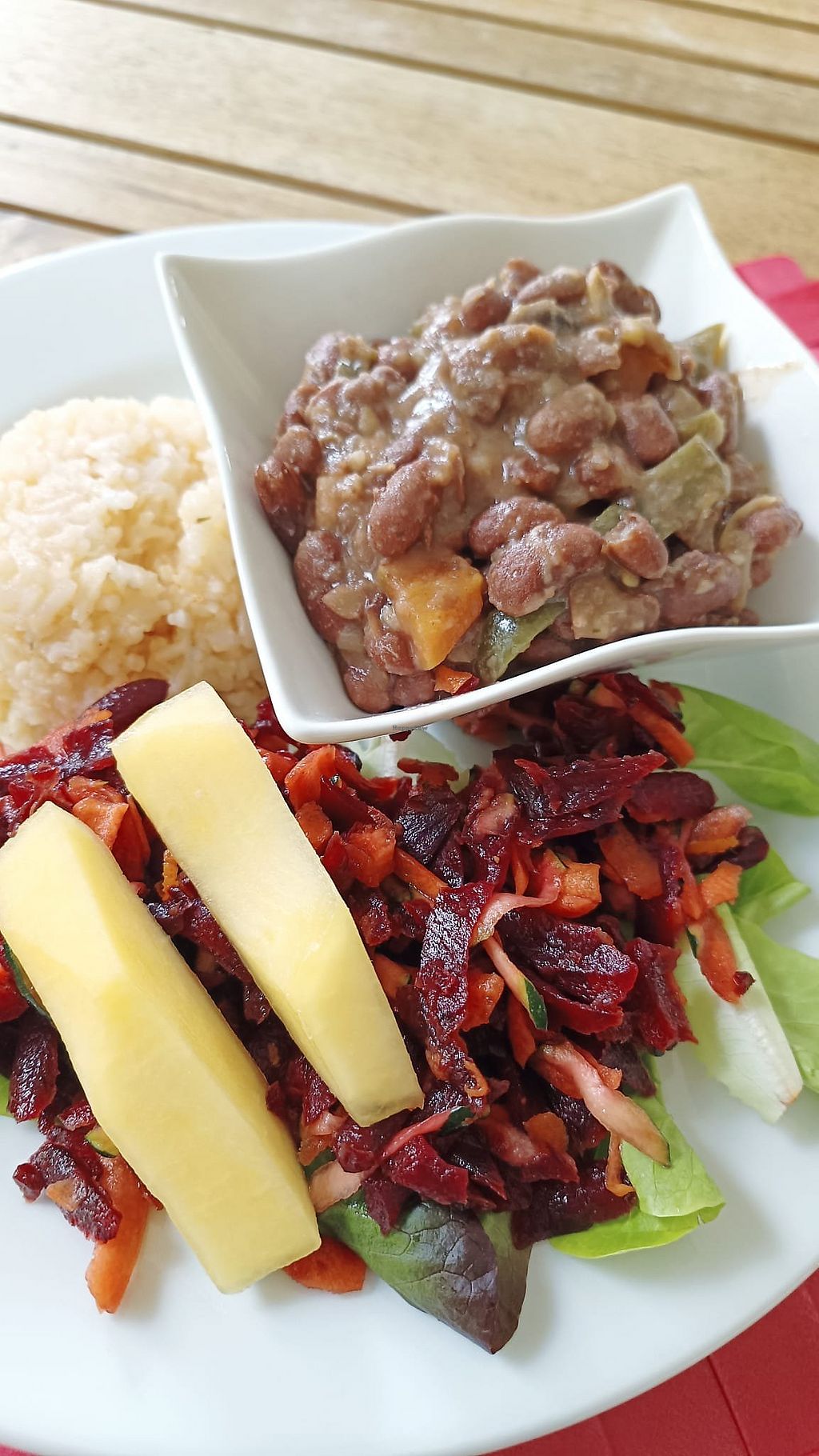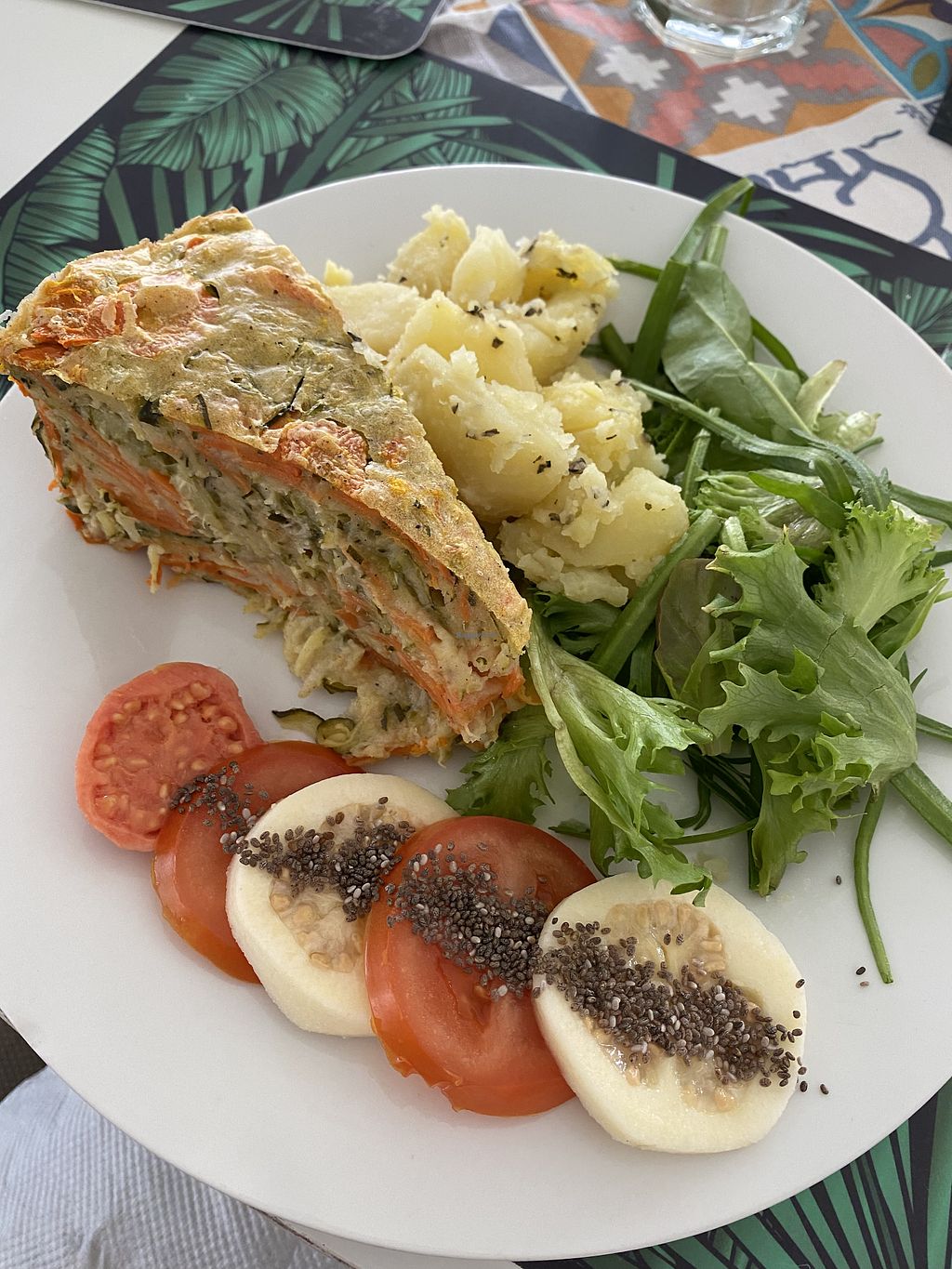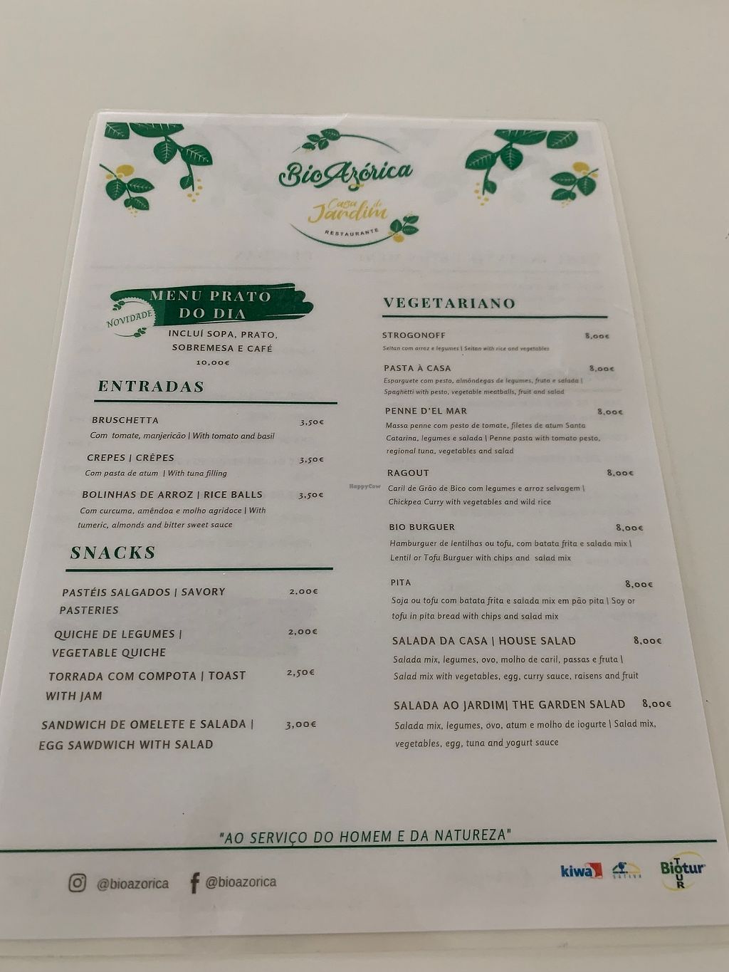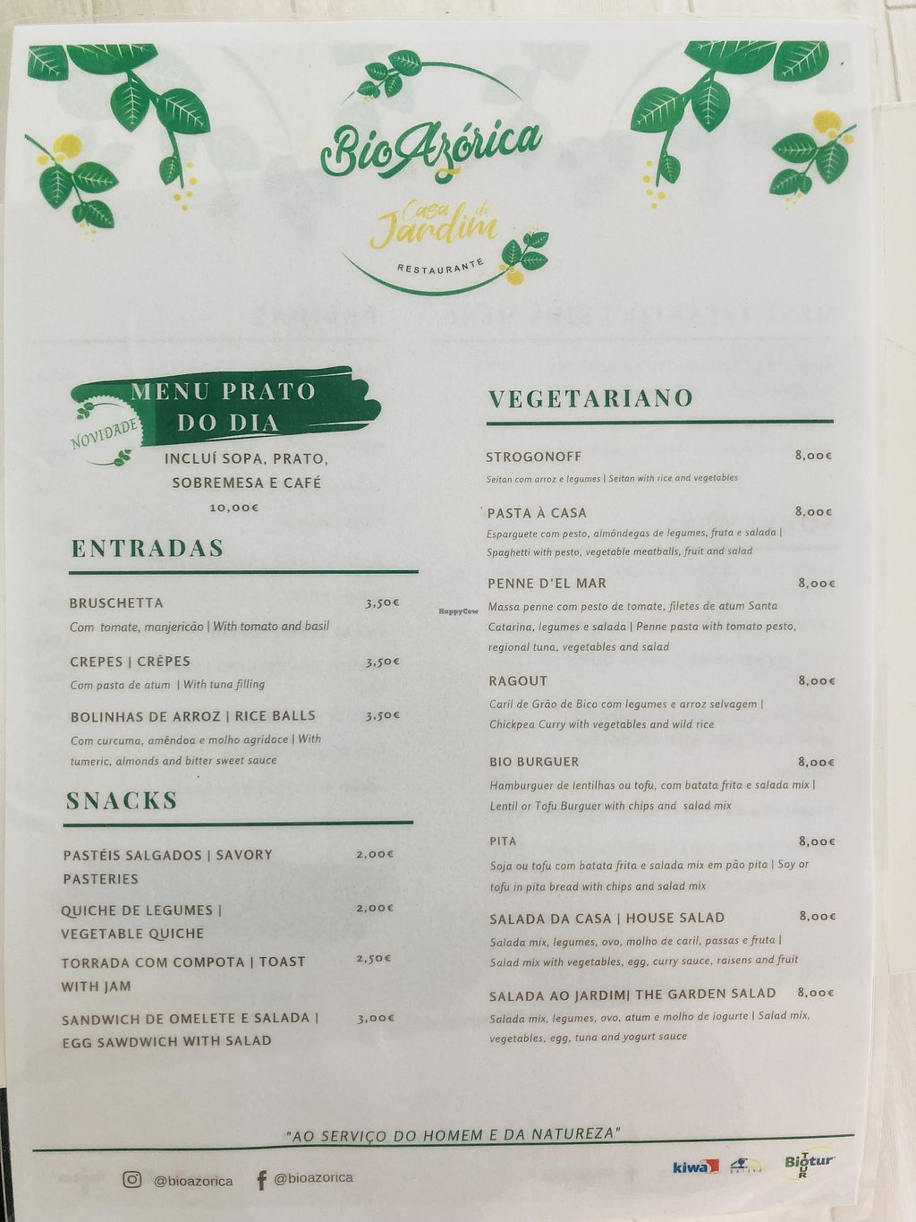 They include 2 dishes with tuna as part of the "vegetarian" menu. Mind that and ask the staff about the vegan options available - I was rest assured that there's always vegan options and, no matter what's on the printed menu, they also have a great value for money dish of the day: soup main dish juice dessert coffee for 10 euros. All fresh and organic, and the surroundings are great. I only had a quick snack (pictured here) - a tasty peas pie with a simple side salad. I'd say this is a very good option for lunch in Angra!