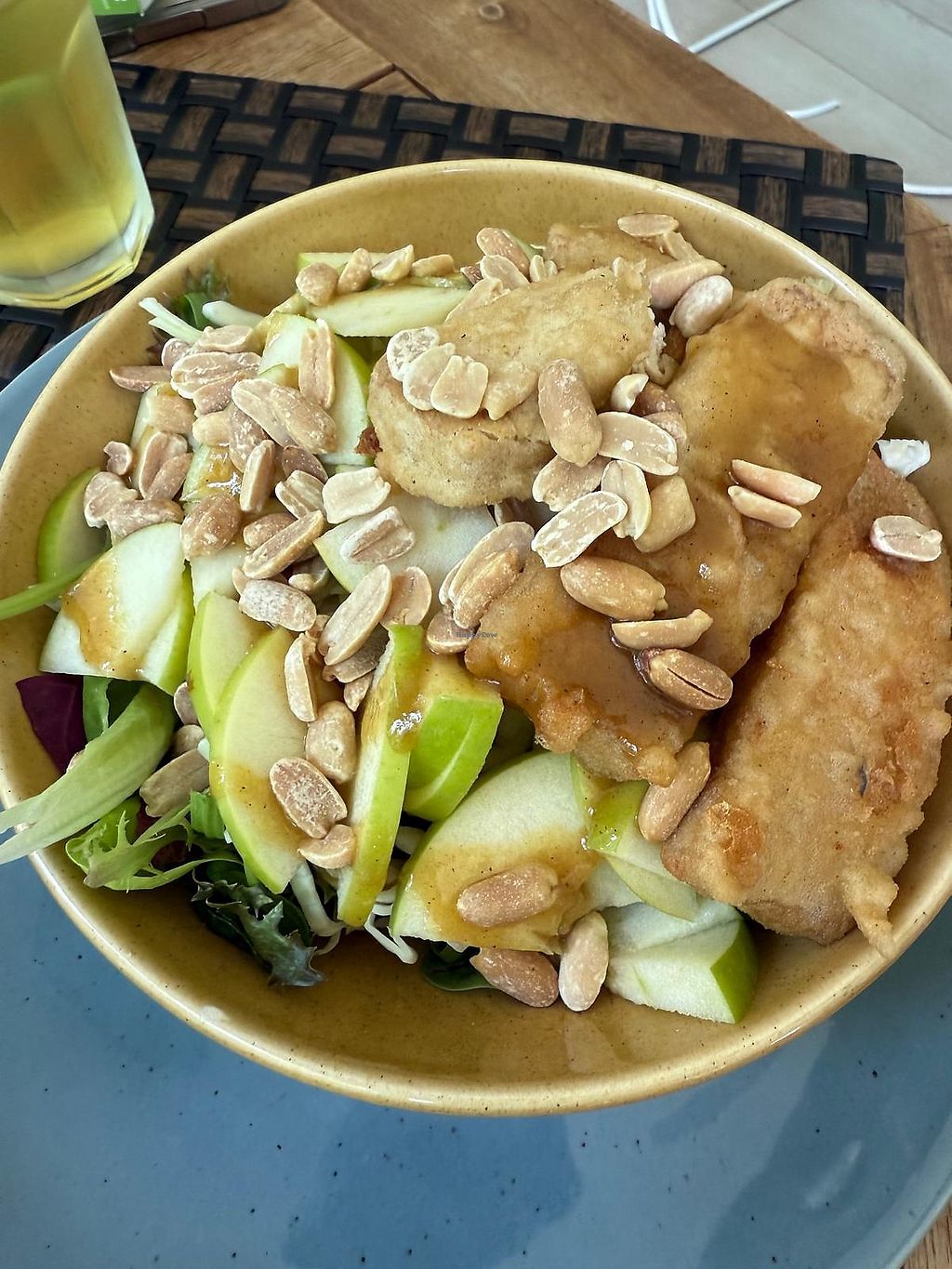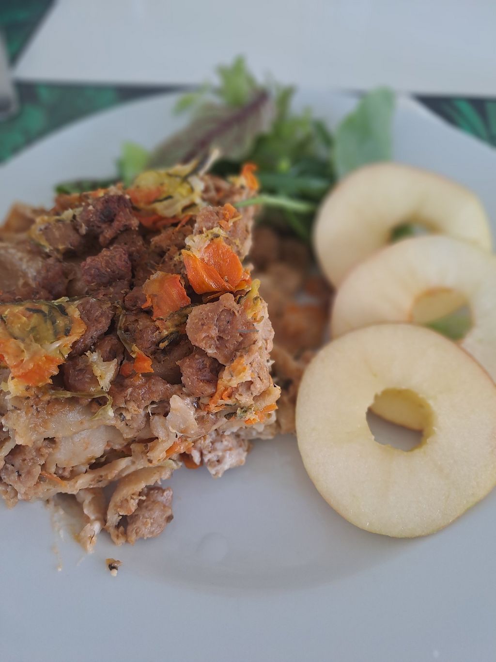 We took the meal of the day, vegan lasagne. It was served with a salad, some apple finely sliced and shredded raw cabbage and was tasty and filling