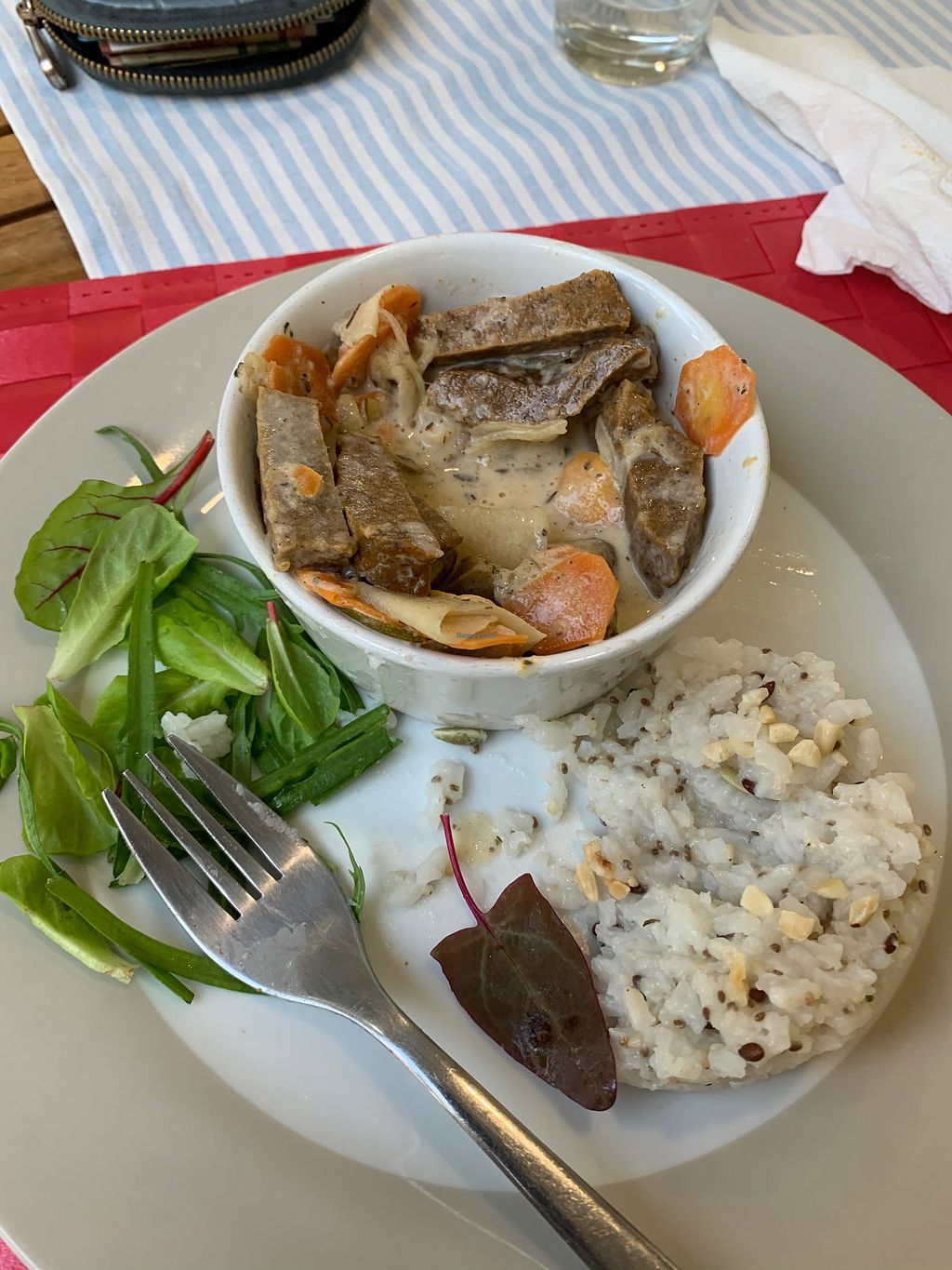 We were unfortunate on our first visit since we arrived at 3:10 and the kitchen closes at 3:00, we then had a very nice quiche and a so-and-so soup. The next day we planned our visit and got to try the amazing Seitan Stroganoff and the dish of the day with bulgur, beans and onion and different vegetables - also very nice! The portions weren’t big enough to be completely satisfying but it gave space for coconut-rice-pudding for dessert - yum! Vegans - come here and try out the rest of their vegan menu!