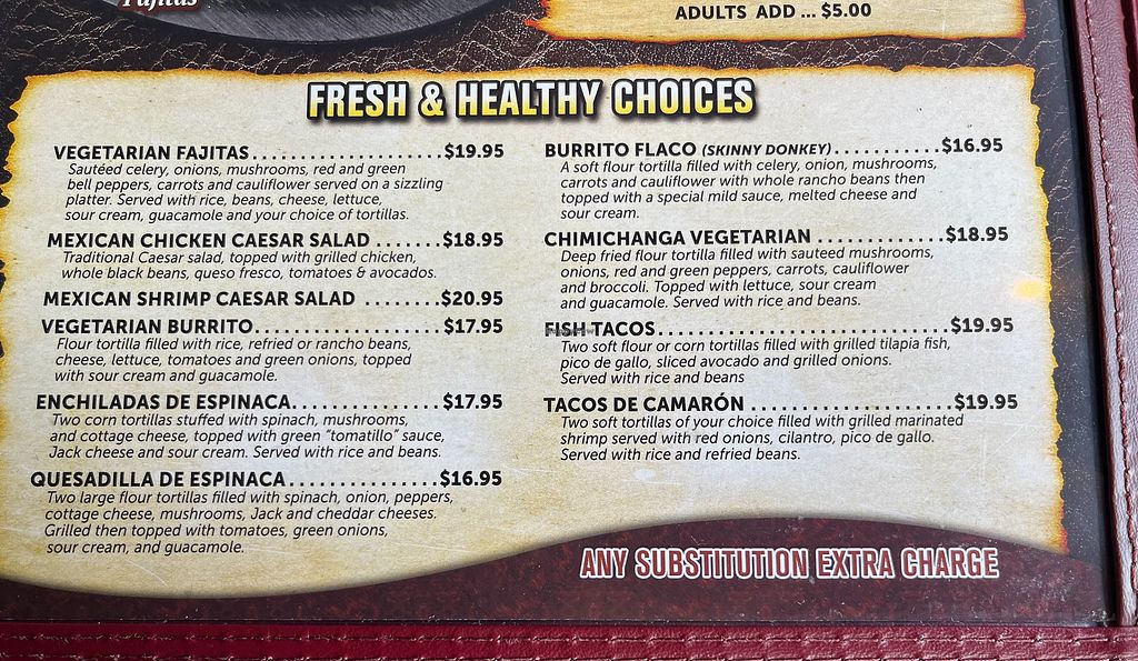 Serves meat, vegan options available. Mexican restaurant with a variety of vegetarian dishes that can be made vegan by removing cheese and sour cream, such as fajitas, burritos, and a dish called "skinny donkey." Open Mon-Sun 10:30am-10:00pm.