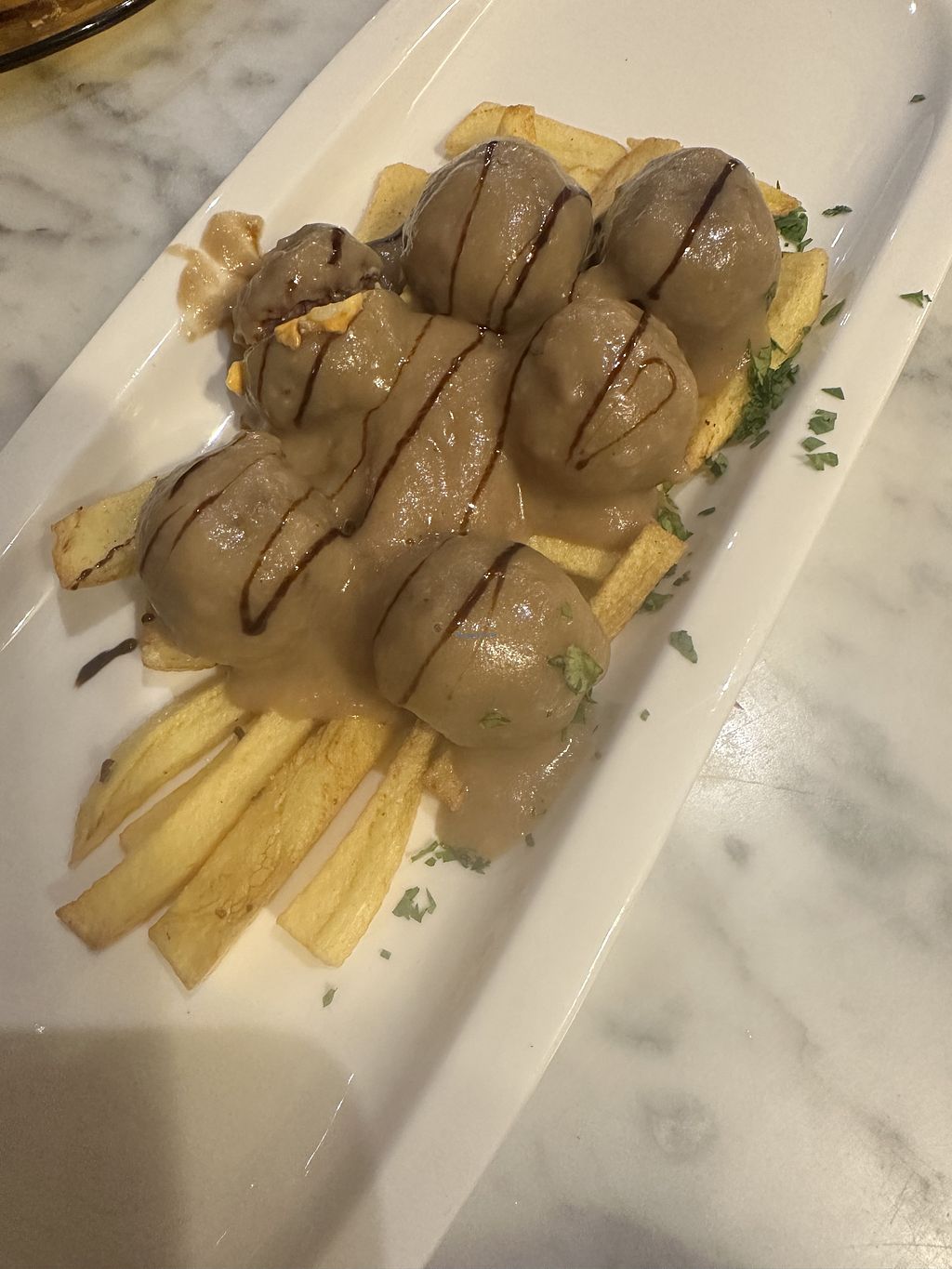 Vegan meatball is white wine saucee