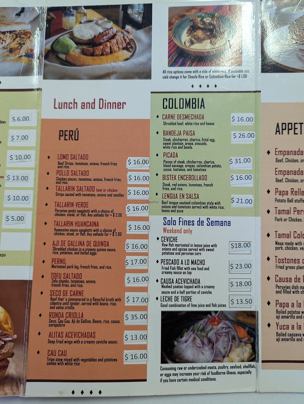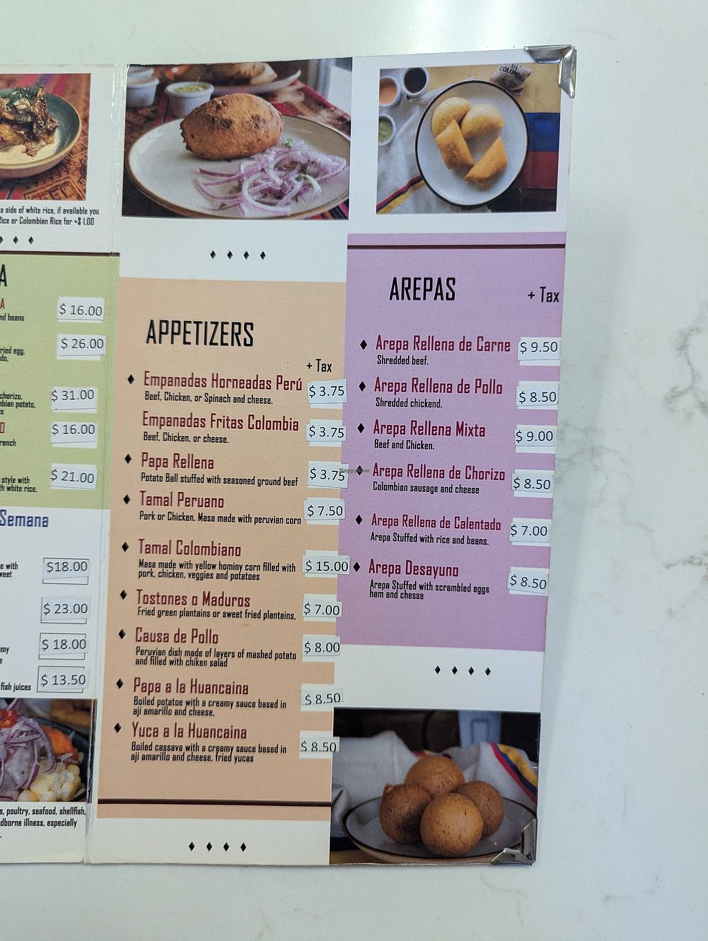 Serves meat, vegan options available. Peruvian and Colombian restaurant offering one vegan option and several vegetarian alternatives. Open Mon 7:30am-8:00pm, Tue-Sat 7:00am-8:00pm, Sun 7:30am-8:00pm.