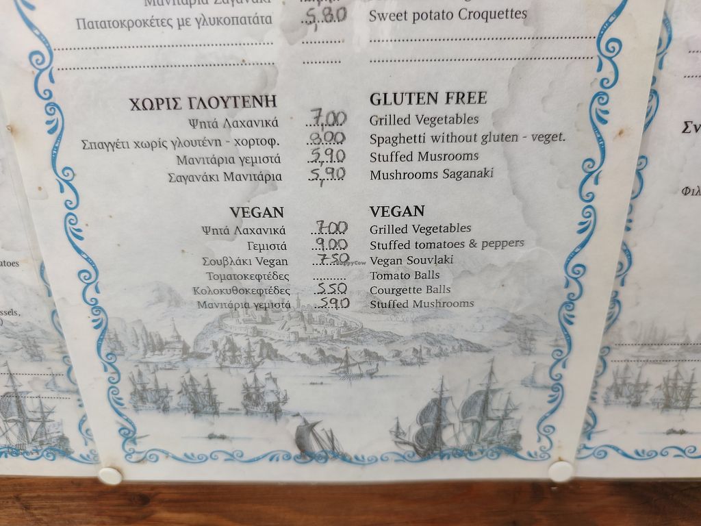 Great harbourside restaurant with very friendly staff offering a few vegan items clearly labelled on the menu at the front, although the menus given once seated didn't have the vegan section as the dishes were spread into the normal categories. It also seemed not all the vegan items were actually vegan, mainly the courgette balls which included cheese that couldn't be taken out, and the garlic mushrooms which could be veganised. The garlic mushrooms were very tasty and quite big when ordered as a starter, and the vegan souvlaki was even bigger! The souvlaki could have been a little bit tastier but overall it was quite good. Price wise it was very reasonable, a meal for my girlfriend and I came to just shy of 40 euro which covered bread, a starter, main and drink each. The staff were very helpful and friendly, they even gave us a free orange cake each at the end but this was unfortunately not vegan so my girlfriend ate them both. Would definitely recommend visiting this restaurant if you are in or near Kassiopi!