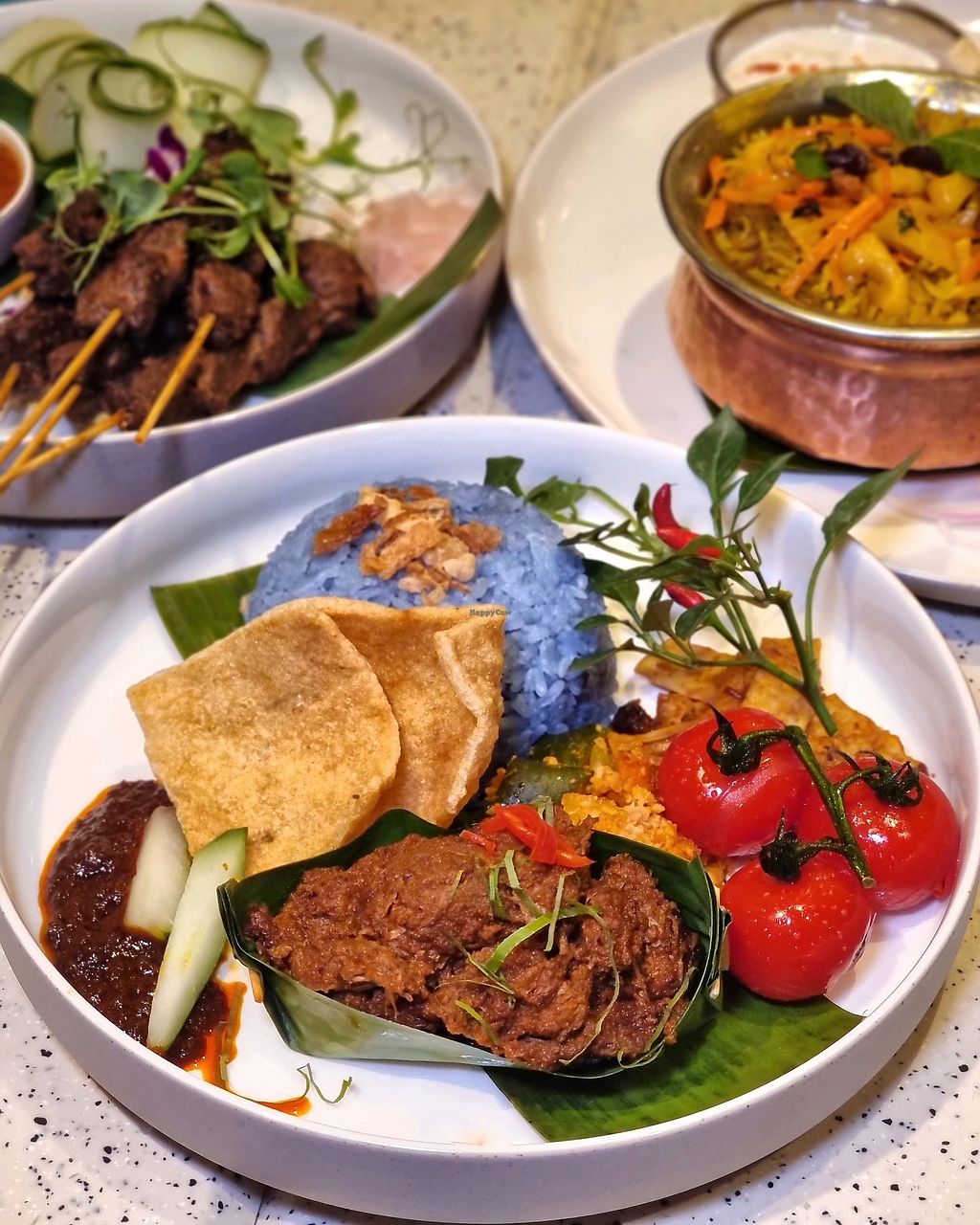 🌱Banana Leaf Dry Braised Beef Rendang -Blue pea flavoured jasmine rice, red chilli sambal, roasted nuts, pickles. The blue pea rice has an excellent texture and very fragrant. Comes with vegan omelette strips.