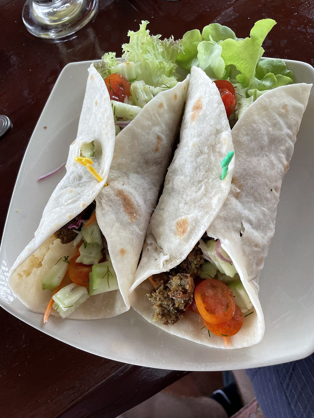 Catfish falafel plate includes ingredients for two pita falafels. The …