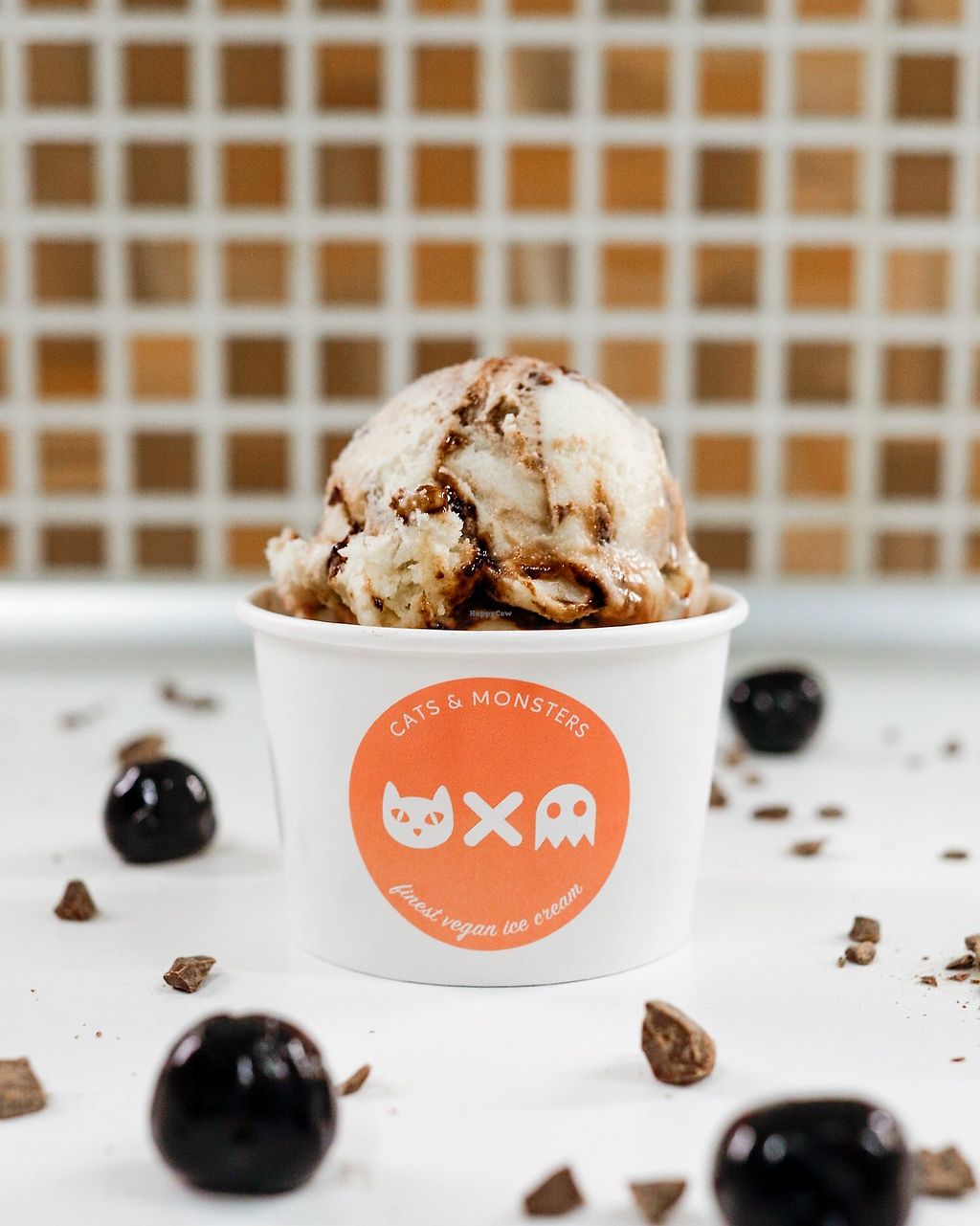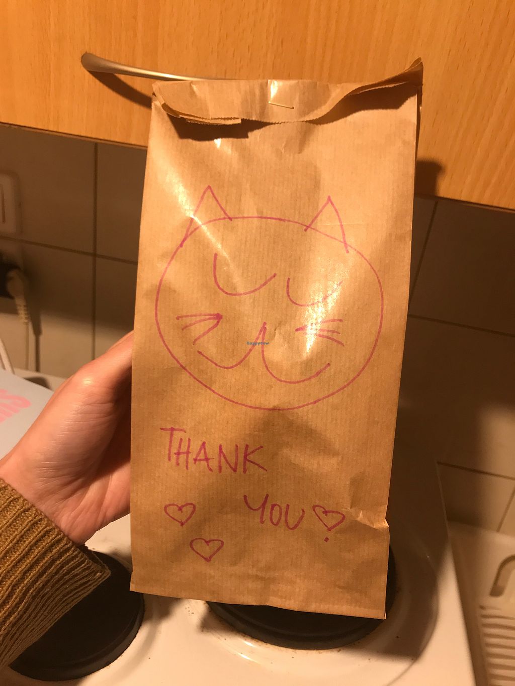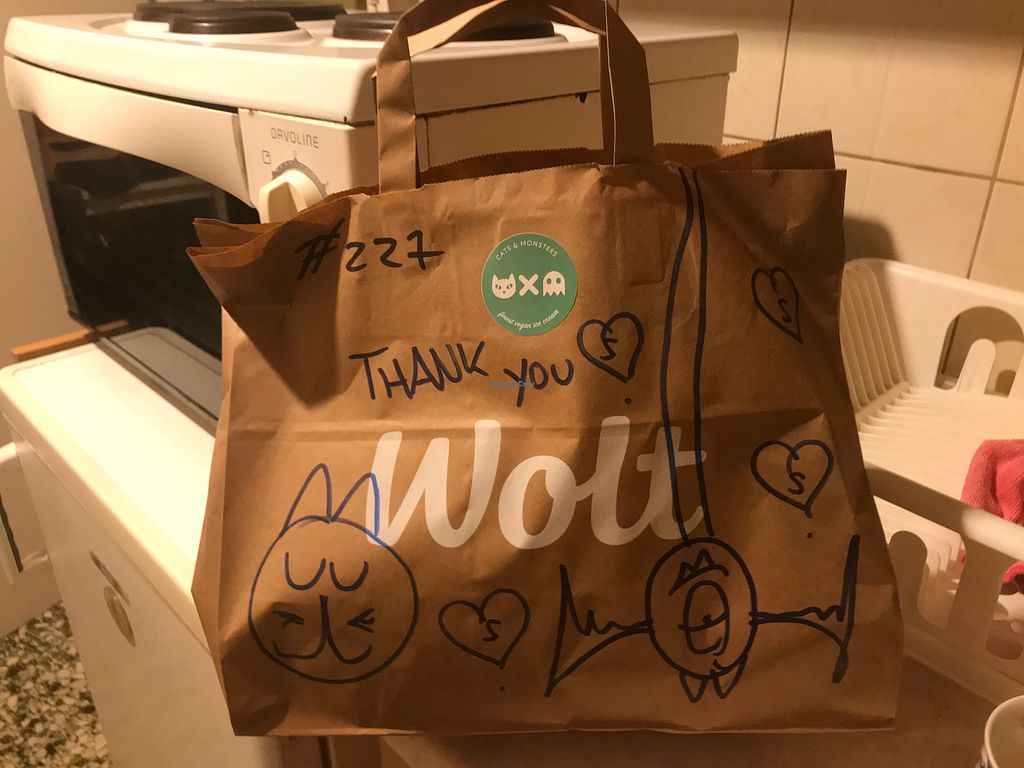 A cat drawn on the vegan ice cream cone delivery bag