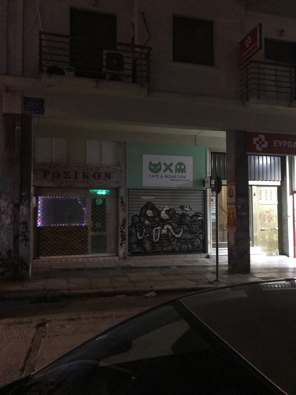 The building, closed at night.