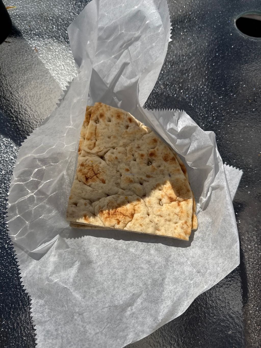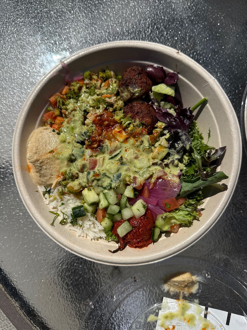 Build your own bowl: brown rice, hummus, eggplant dip, potatoes, falaf…