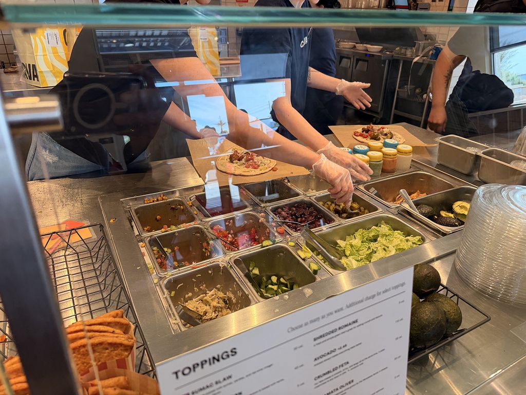 Serves meat, vegan options available. Fast-casual Mediterranean restaurant chain where the food is ready-cooked and displayed on the counter. Choose your base (all vegan), then add dips, protein, toppings (all vegan except crumbled feta cheese), and a dressing (all vegan except yogurt dill and sriracha greek yogurt) for your bowl or salad. Point to what you'd like. Reported to HC as to having labeled vegan items, ask for menu at the front of the store which shows GF, DF, Veg*n, and SF options. Open Mon-Wed 11:00am-10:00pm, Thu 11:00am-7:00pm, Fri-Sun 11:00am-10:00pm.
