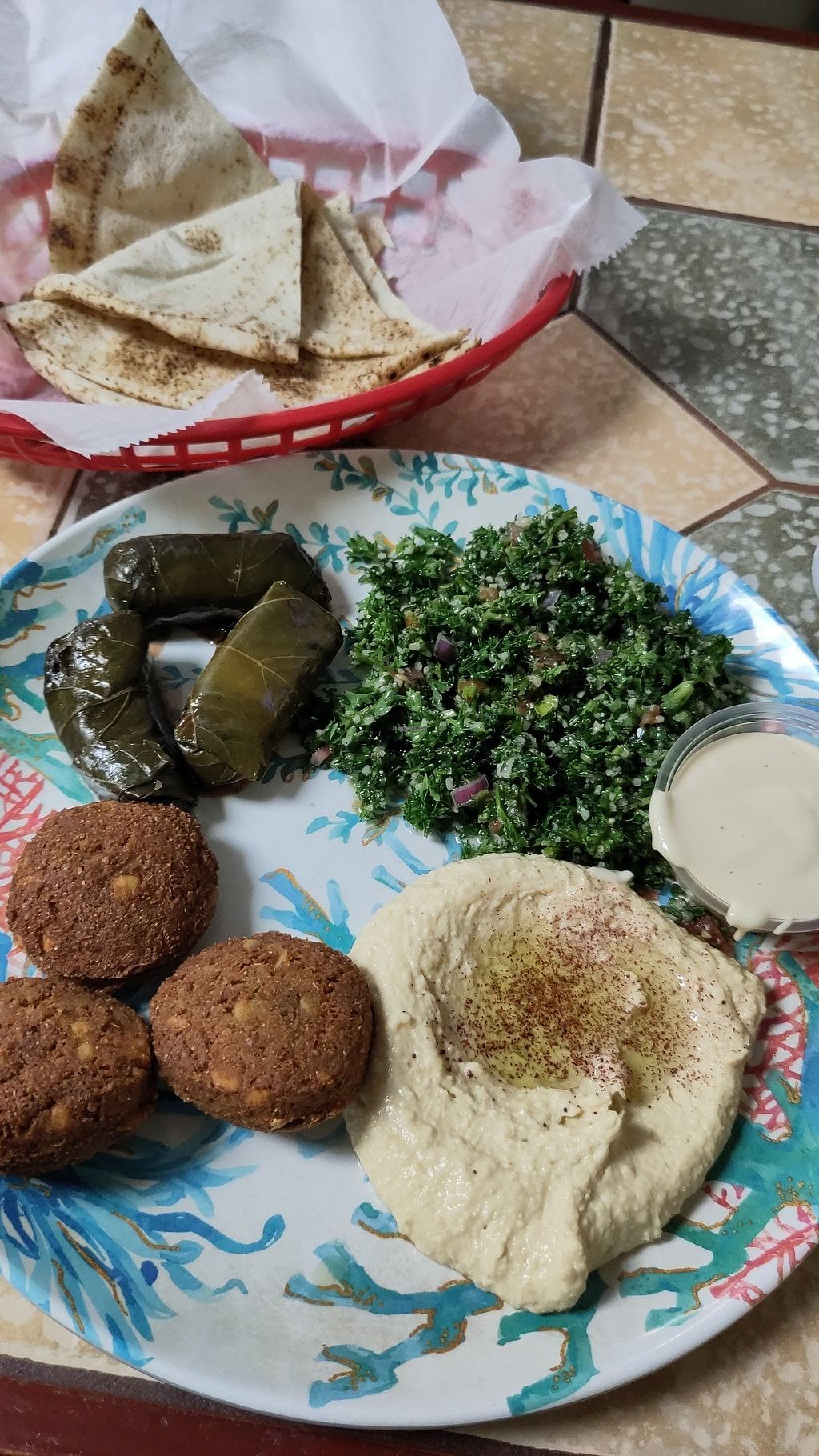 Very tasty and food made fresh. I had the vegetarian platter and substituted the tabbouleh for a house salad because I’m GF. The falafel was 11/10.