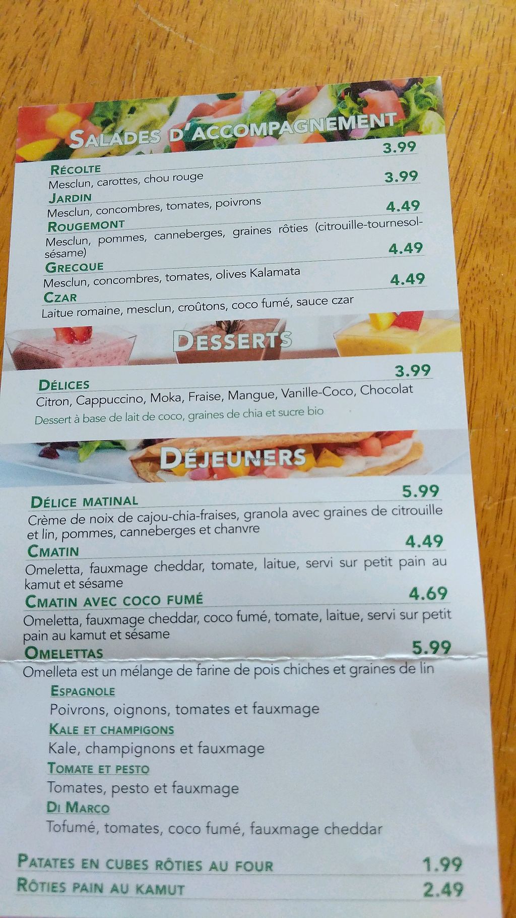 I've seen this place for a while as it's located inside la moisson health store and one day we decided to give it a try. We had a breakfast omelette and a grilled cheese. I also ordered a moka smoothie which I liked a lot. The omelette was great!!! The grilled cheese was good as well. What I loved the most are the prices. Between 5 and 9$ for a meal, they're not huge but fairly satisfying. Recommanded for a little breakfast. Will update after trying their burgers and pizza!