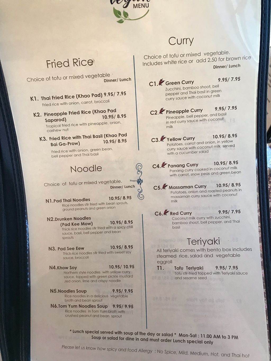 I love vegan options at this restaurant! They offer full vegan menu. I love their Pad Thai, Drunken Noodle and Green curry. There are delicious. Staff very attentive and this place very clean. Definitely be back!
