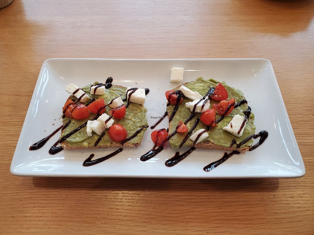 Avo toast is great. Good bread and tomatoes... not very spicy, but great bread. Coffee: no soy milk? Oat milk at least.
