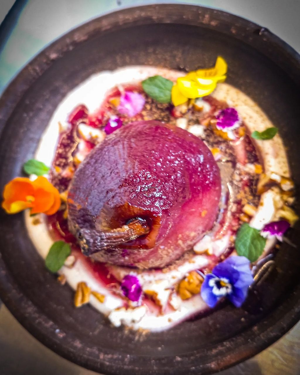 Pera al vino con crema de caju