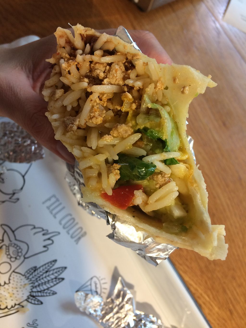Got the vegan burrito with tofu. Tofu was mashed and I got a lot of rice in it, some salad and a bit of beans.. really boring.