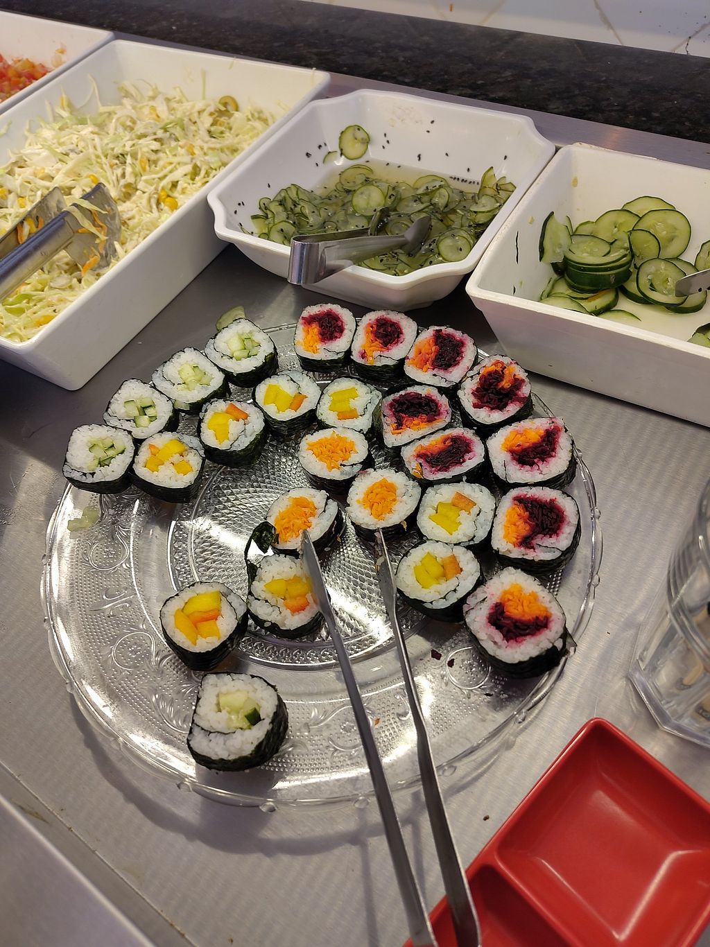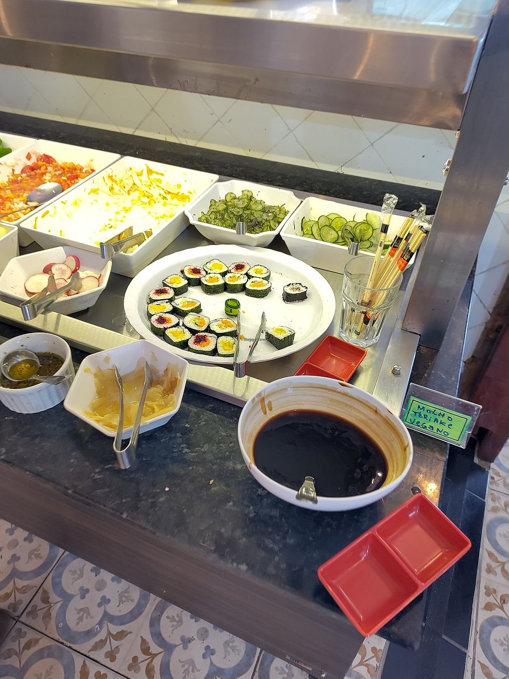 prato do buffet à vontade, as "carnes" veganas passam na mesa, como em…