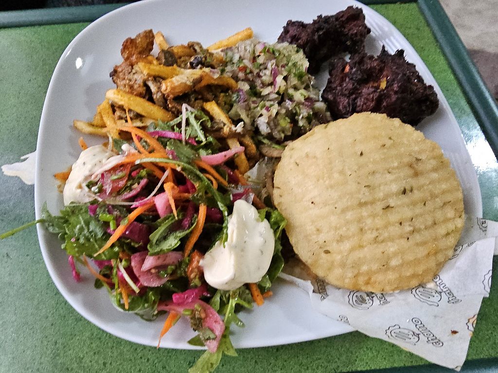 Love their Oyster mushroom arepas, oyster mushroom loaded fries, cauliflower fritters, and side salad. Good vegan and gluten free options available.