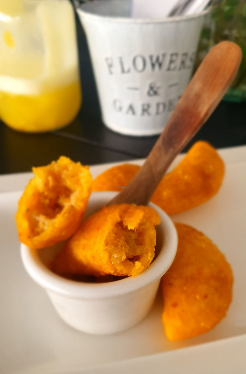Tropical fruit juice; pureed pumpkin soup; beet hummus, fritter, quino…