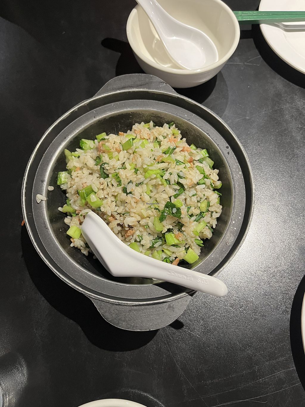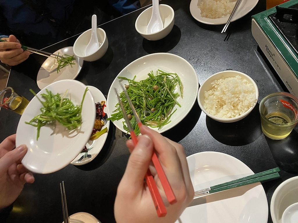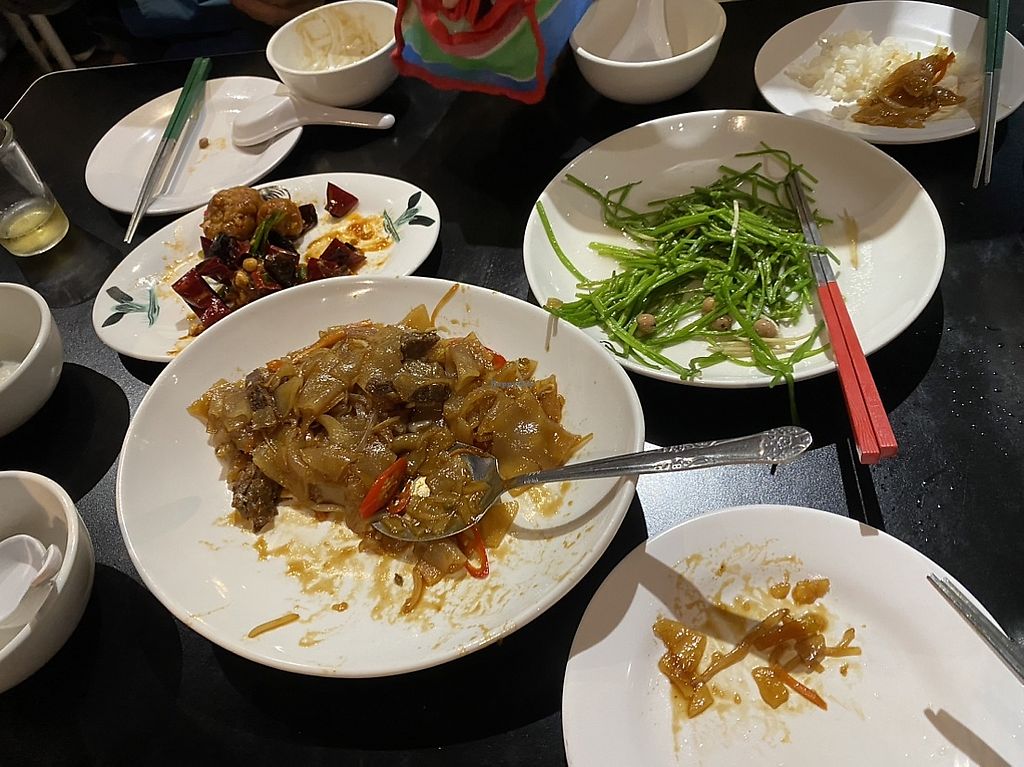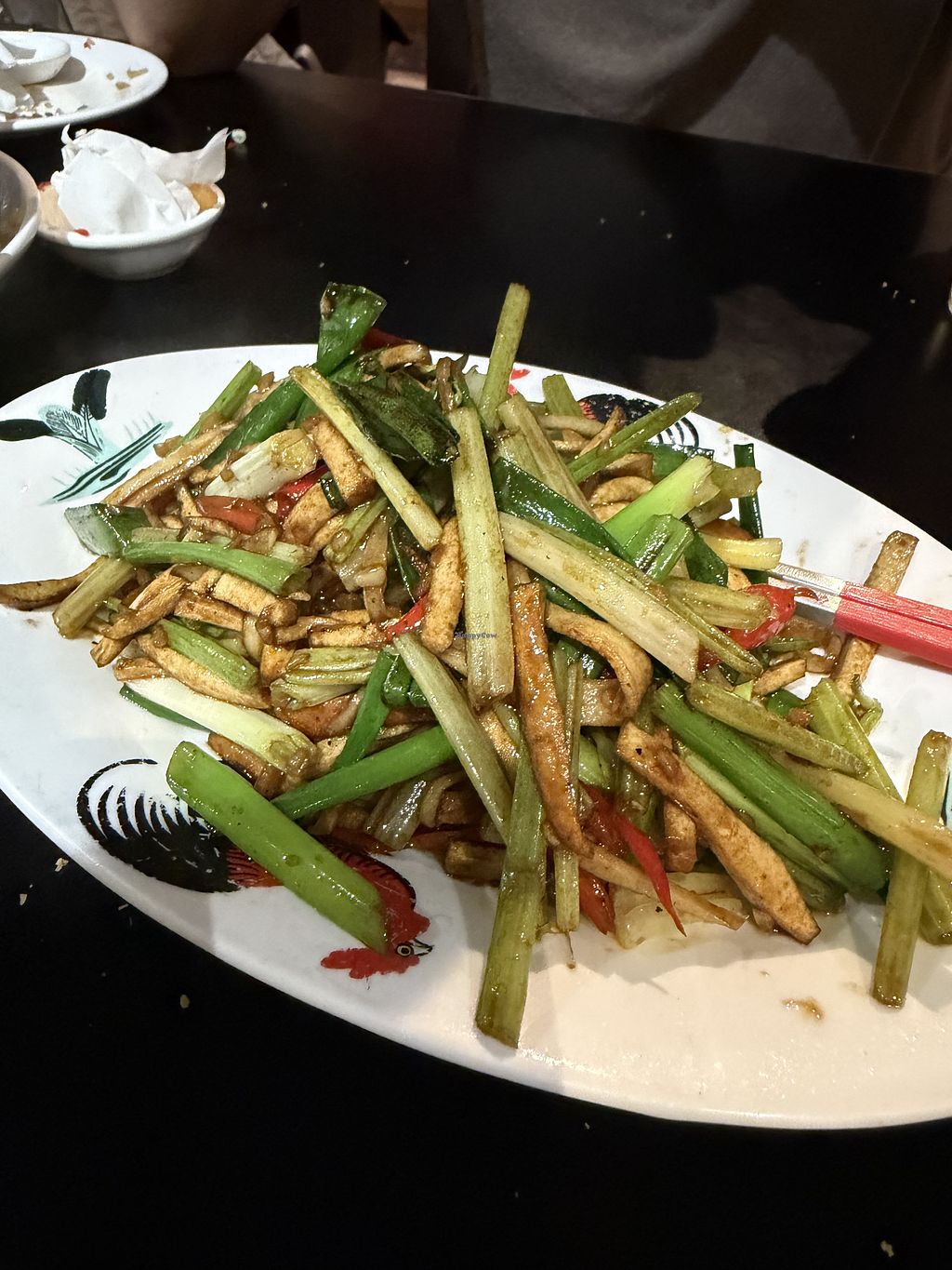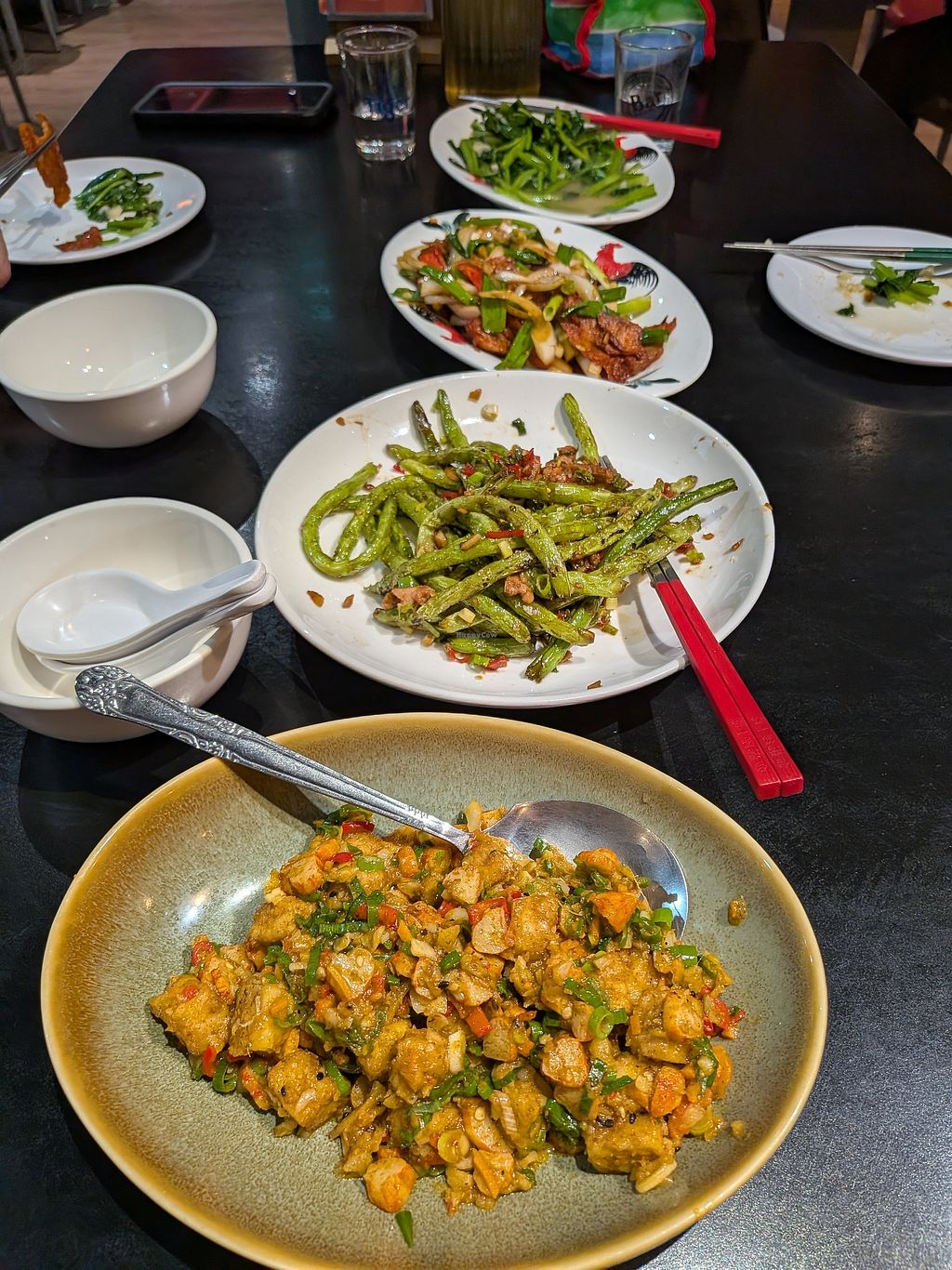 Stir fried veg, stir fried pork with scallion and onions, stir fried g…