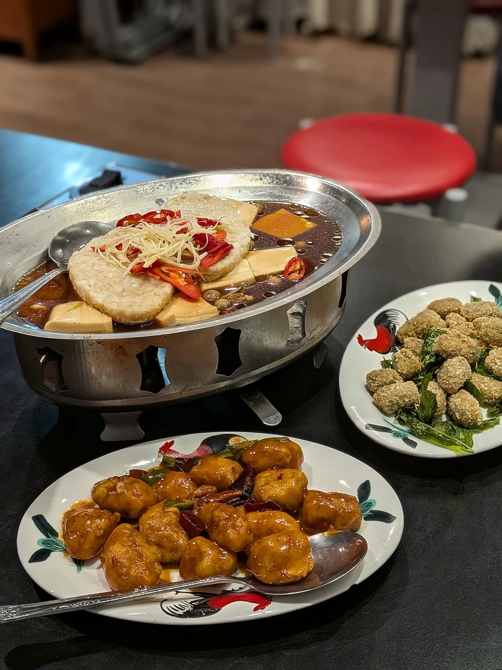 Steamed cod, fried oyster, kung pow chicken