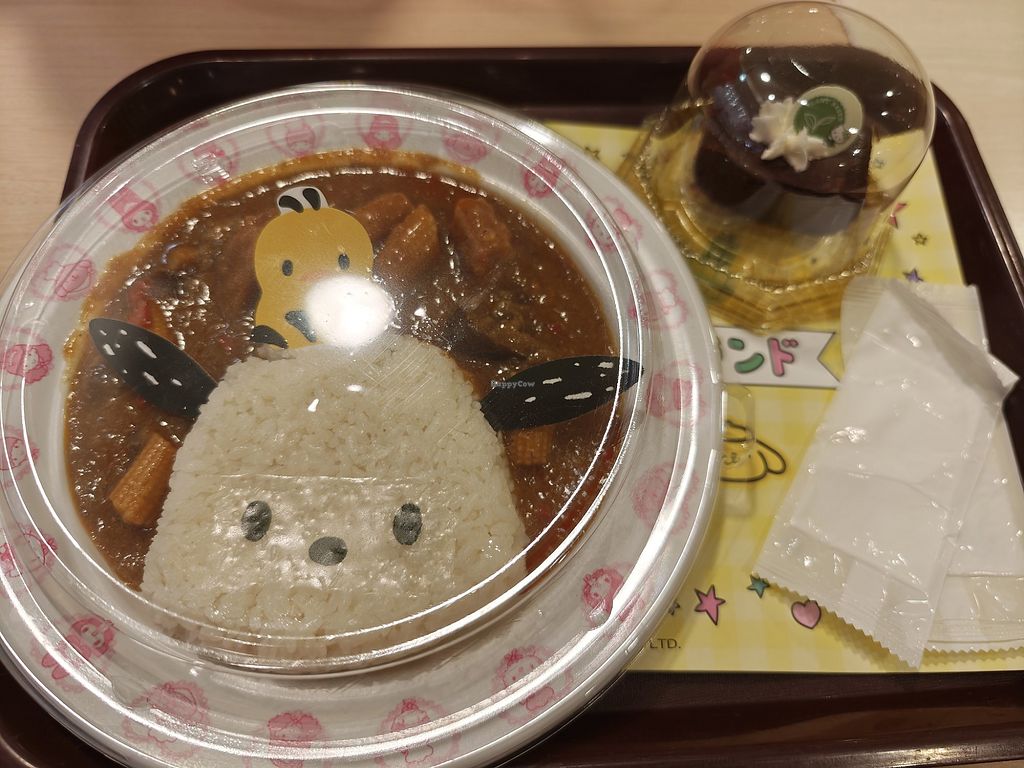 At least they have vegan options😄not so special, but also not bad! ☺️ A Pochacco curry and a vegan choc devil cake!