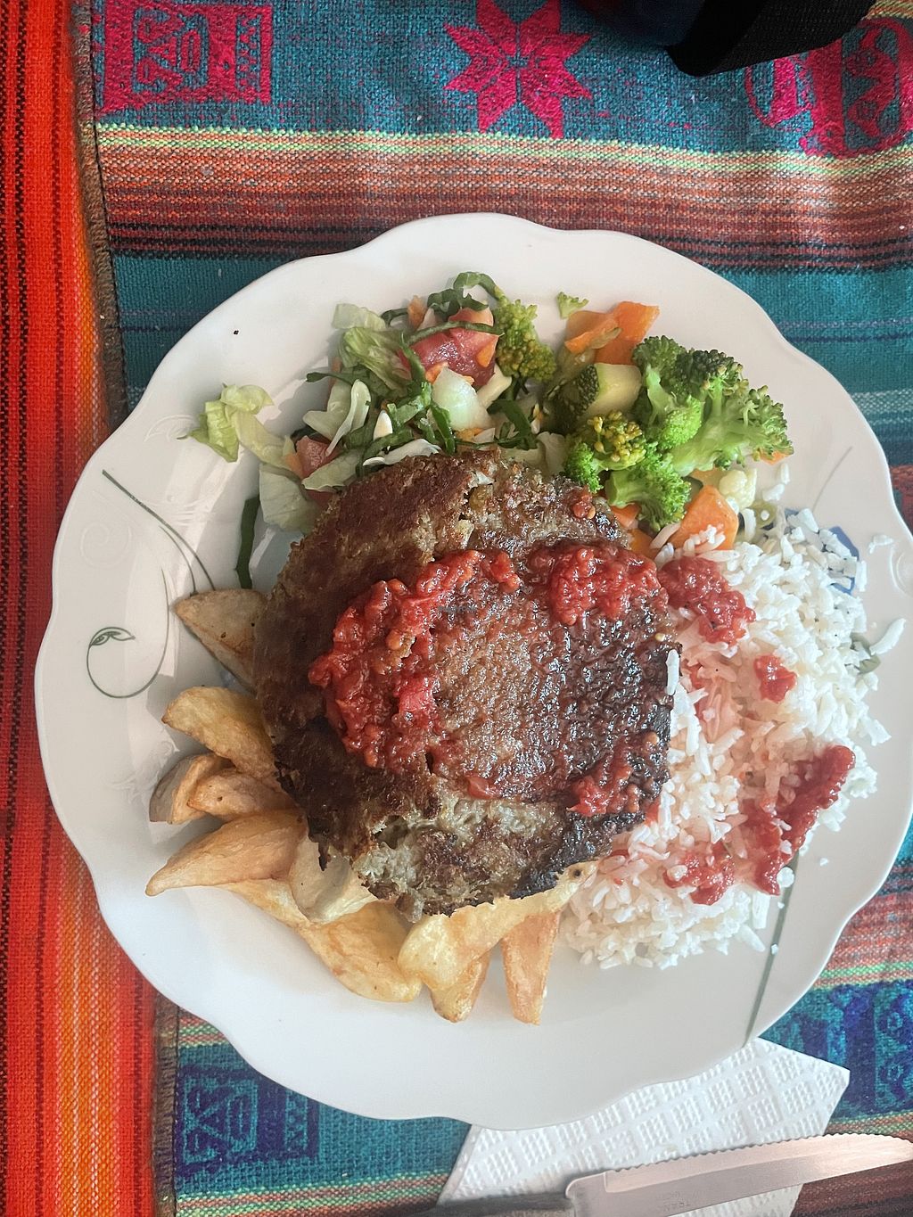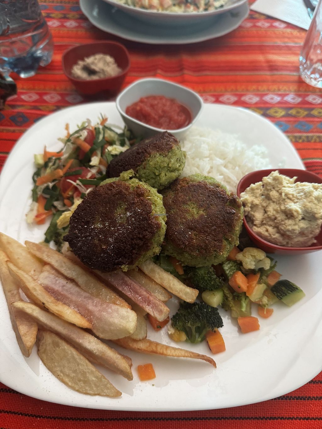 Set meal main - lentil patty with rice, fries & salad - tasty & fillin…