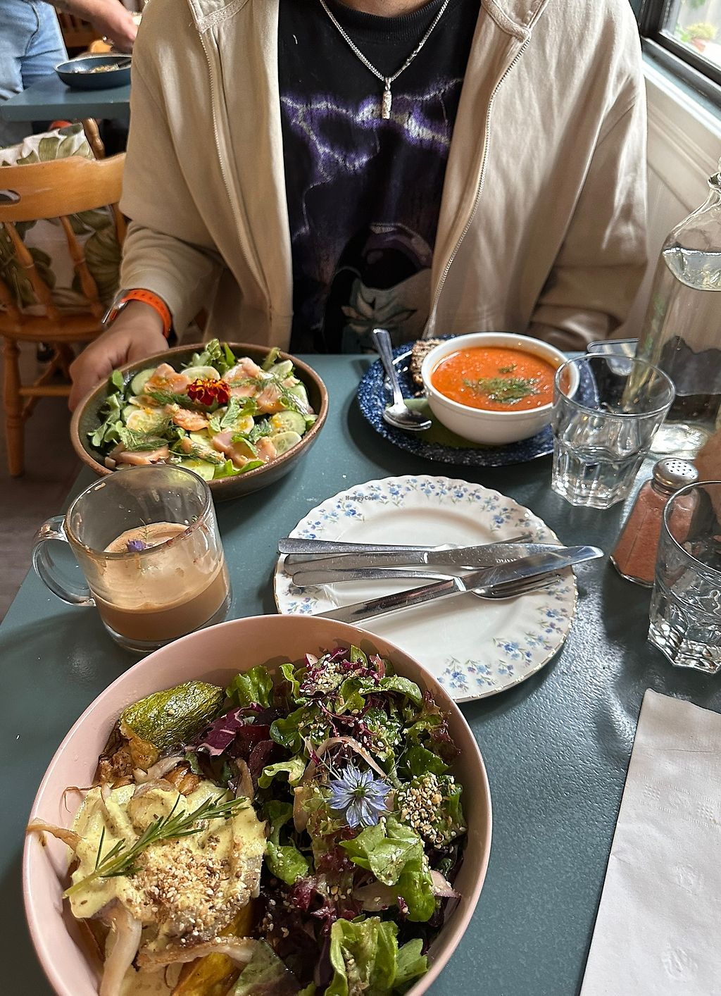Beautiful patio, a couple vegan options but pretty limited. The food was tasty, but very small portions for the price. We also waited a full hour for lunch (soup with bread)