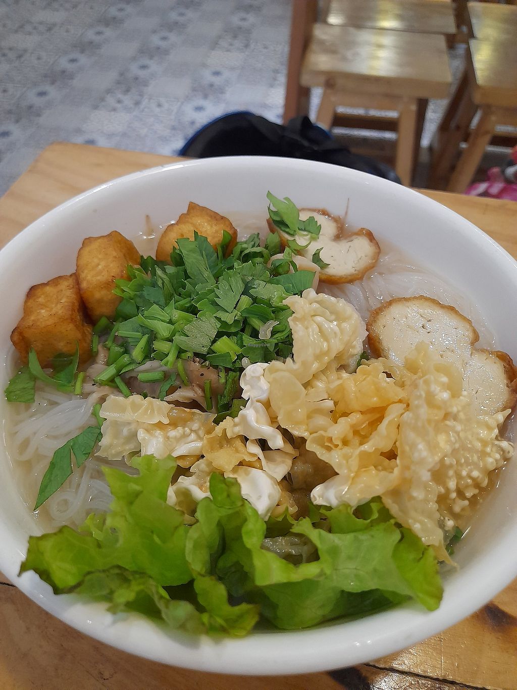 I ordered two things for order this evening: crispy fried noodles and banh mi. The noodles came with lots of bright, fresh veggies, but I didn’t feel like the dish was as tasty as it could have been. I’ve had versions of this from Chinese cuisine that have more flavor, often with a thicker sauce. The one here has a thinner sauce. Perhaps it’s just a personal preference. The banh mi was good. It has (at least) two types of mock meat alongside cucumber. I couldn’t believe how cheap it was—it was 15k vnd, which is cheaper than any street vendor banh mi that I’ve seen.
