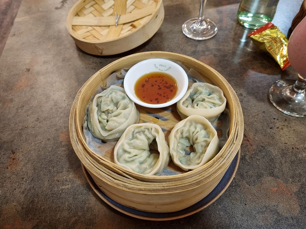 Wir hatten Sommerrollen und gefüllte Teigtaschen als Vorspeisen, einen Lassi mit Sojamilch und als Hauptspeise veganes Hähnchen mit Nudeln aus Soja und Sesamtofu. Und ich fand alles davon sehr lecker! Es gibt eine echt große Auswahl, u.a. vegane Ente (Seitan) und veganes Hähnchen (Soja), Curry, Reis, Nudeln und typische asiatische Vorspeisen (Frühlingsrollen, gesalzene Edamame, Sommerrollen, Dumplings etc.). Würde hier jederzeit wieder essen gehen!
