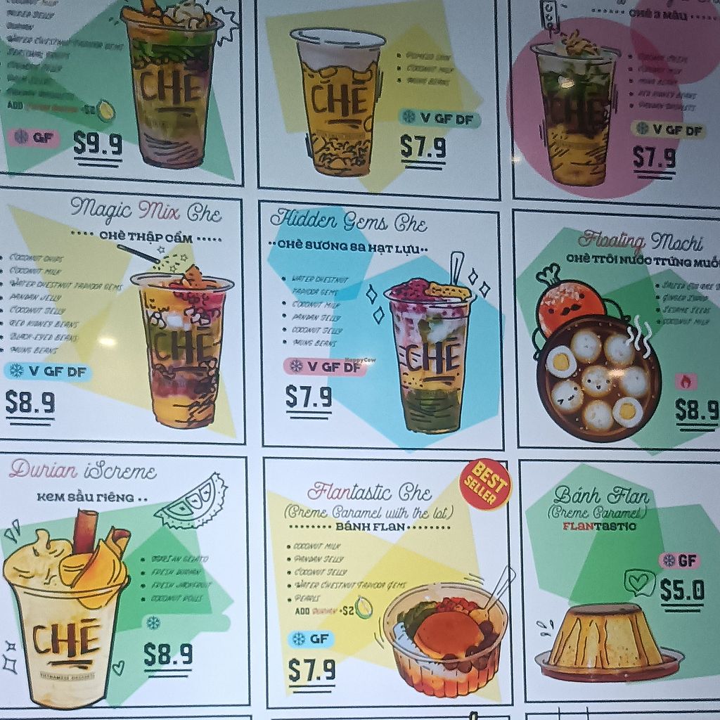 Vietnamese dessert shop with clearly labeled menu offering a variety of chè and other beverages. Open Mon-Thu 12:00pm-9:00pm, Fri-Sat 12:00pm-10:00pm, Sun 12:00pm-9:00pm.