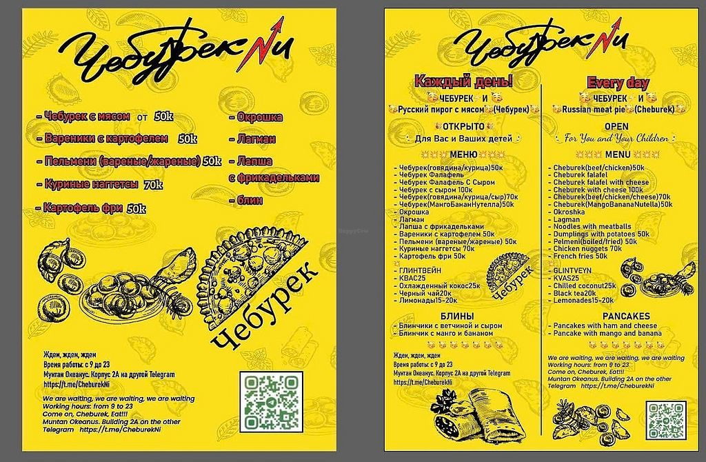 Serves meat, vegan options available. Restaurant offering vegan choices such as cheburek with falafel, salad with cucumber & tomatoes, boiled potatoes and dumplings with potatoes. Open Mon-Sun 9:00am-11:00pm.